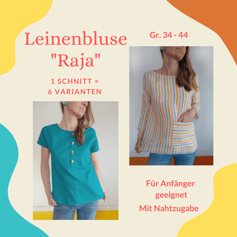 RAJA ist eine Damenbluse, die in vier verschiedenen Varianten genäht werden kann und ist für Webstoffe ausgelegt. (Leinen, Baumwolle, Tencel, Chambray, Flanell…) Die Bluse ist leicht oversized geschnitten, nach unten A- förmig, hat einen lockeren Arm und ein schlichten Rundhalsausschnitt. Die Bluse ist kinderleicht zu nähen und perfekt für Anfänger ausgelegt. Erfahrene Näherinnen können hier ihre Kreativität spielen lassen und mit Stoffen und Varianten experimentieren.