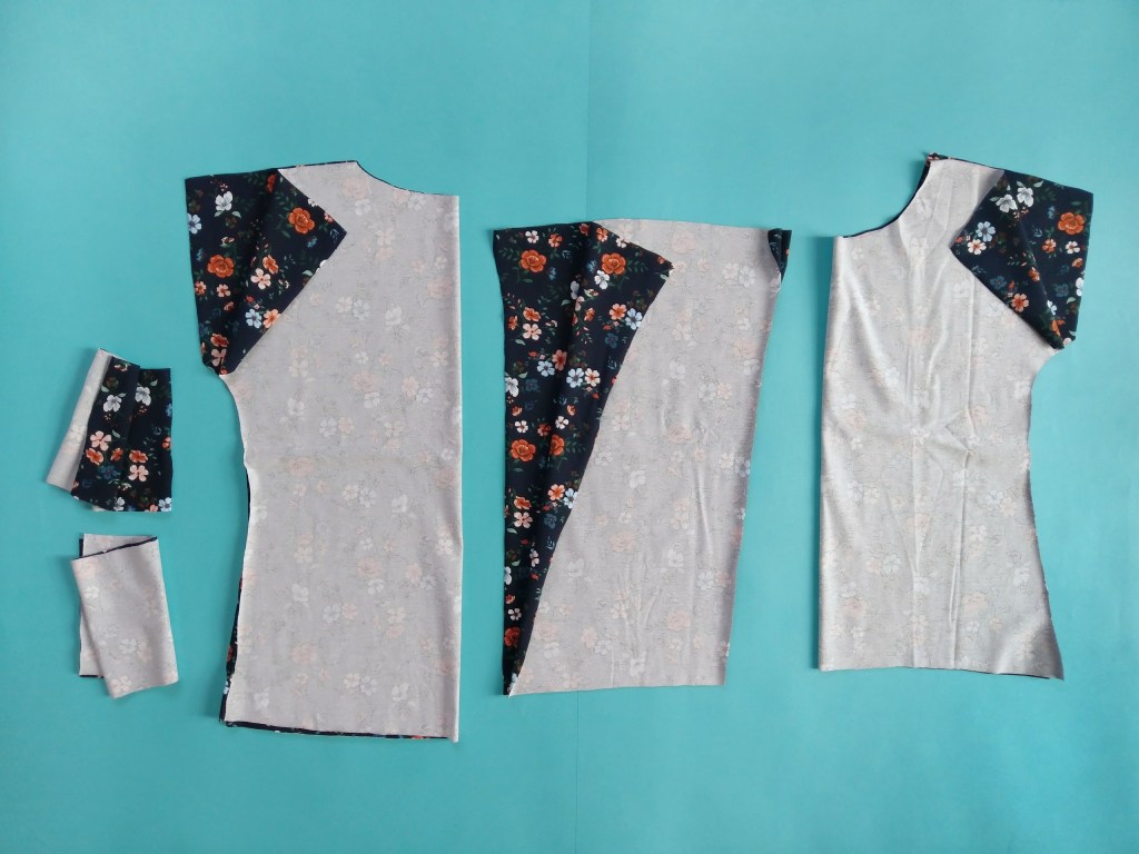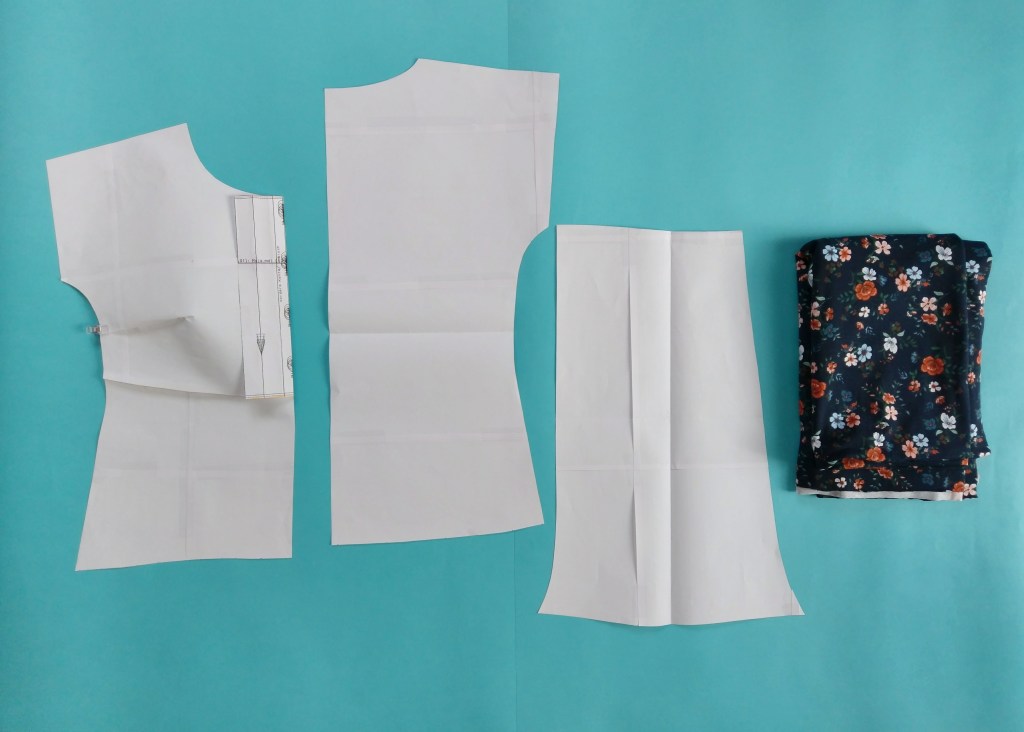 Du benötigst das Vorderteil (das Schößchen muss hier festgeklebt werden wie in Variante 3 im Ebook beschrieben), das Rückenteil und den Ärmel. Der Burstabnäher wird zusammengeklappt und auf dem Stoff nicht übertragen.