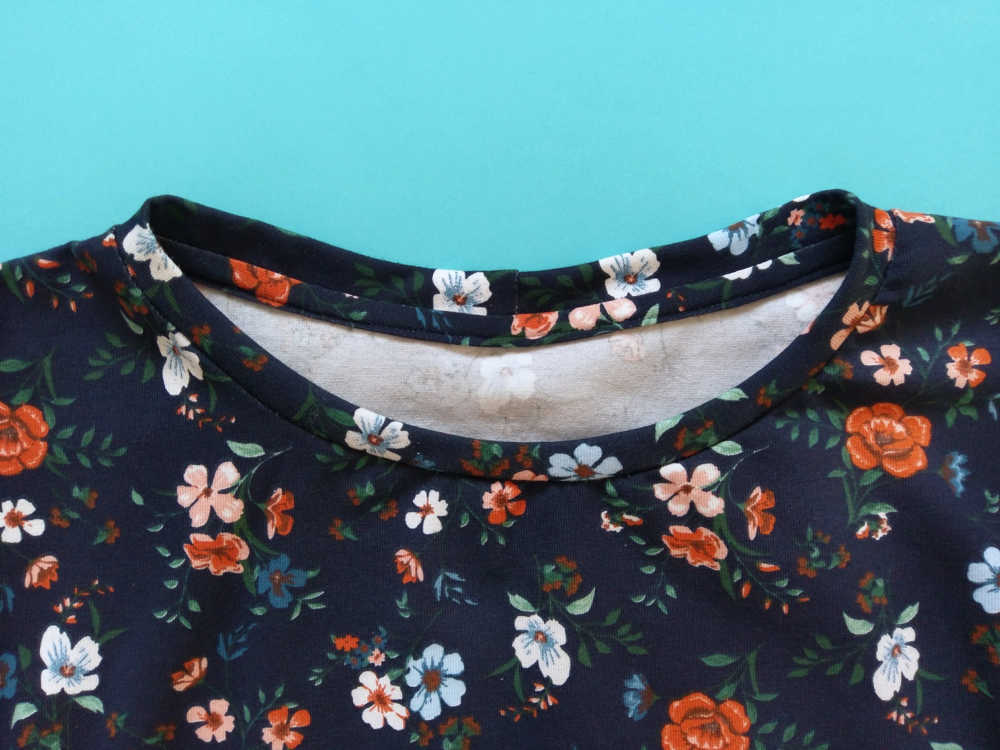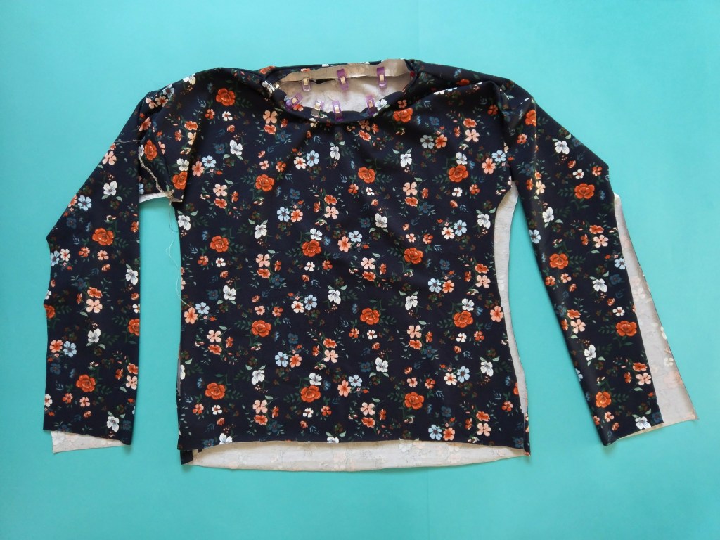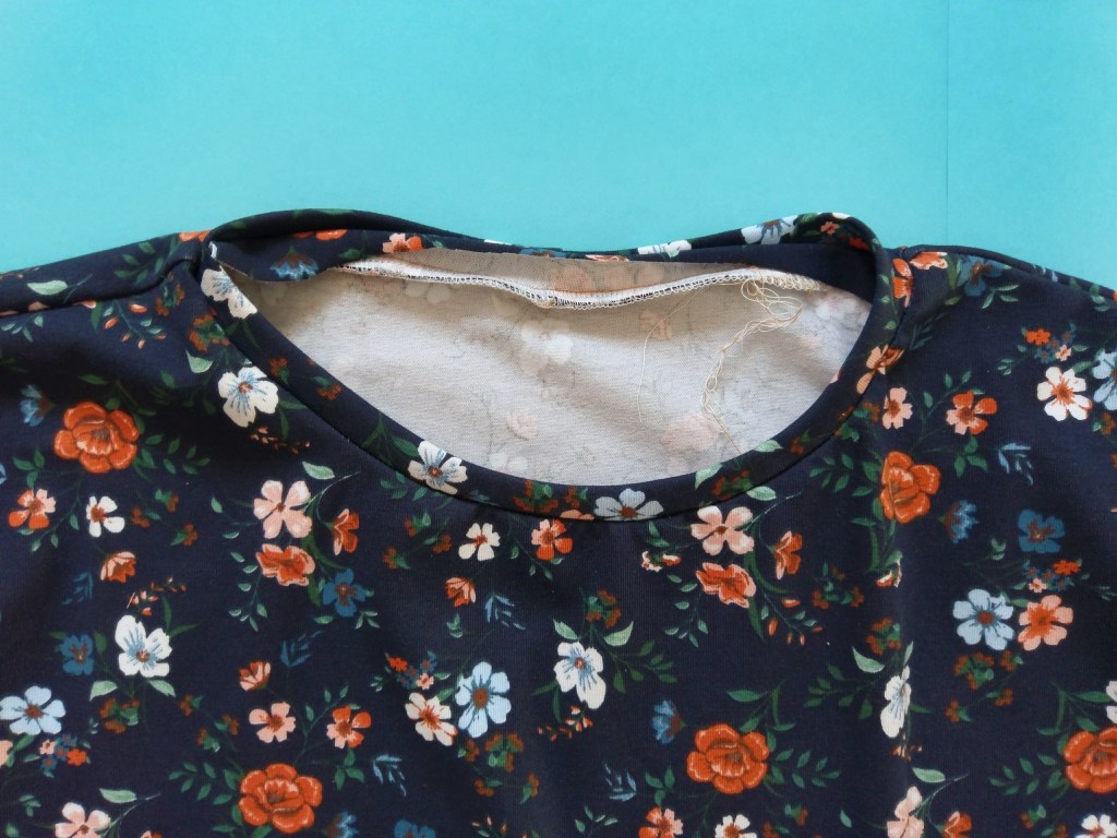 Zuerst wird die Schulternaht geschlossen. Als nächstes wird der Halsausschnitt versäubert. Mit einem Maßband, messe ich das Halsloch aus. (Mein Halsausschnitt ist 56 cm lang. Das Bündchen habe ich 48 cm lang und 4 cm breit zugeschnitten.) Das Halsbündchen wird an der kurzen Schnittkante zu einem Ring geschlossen und links auf links zusammengeklappt.