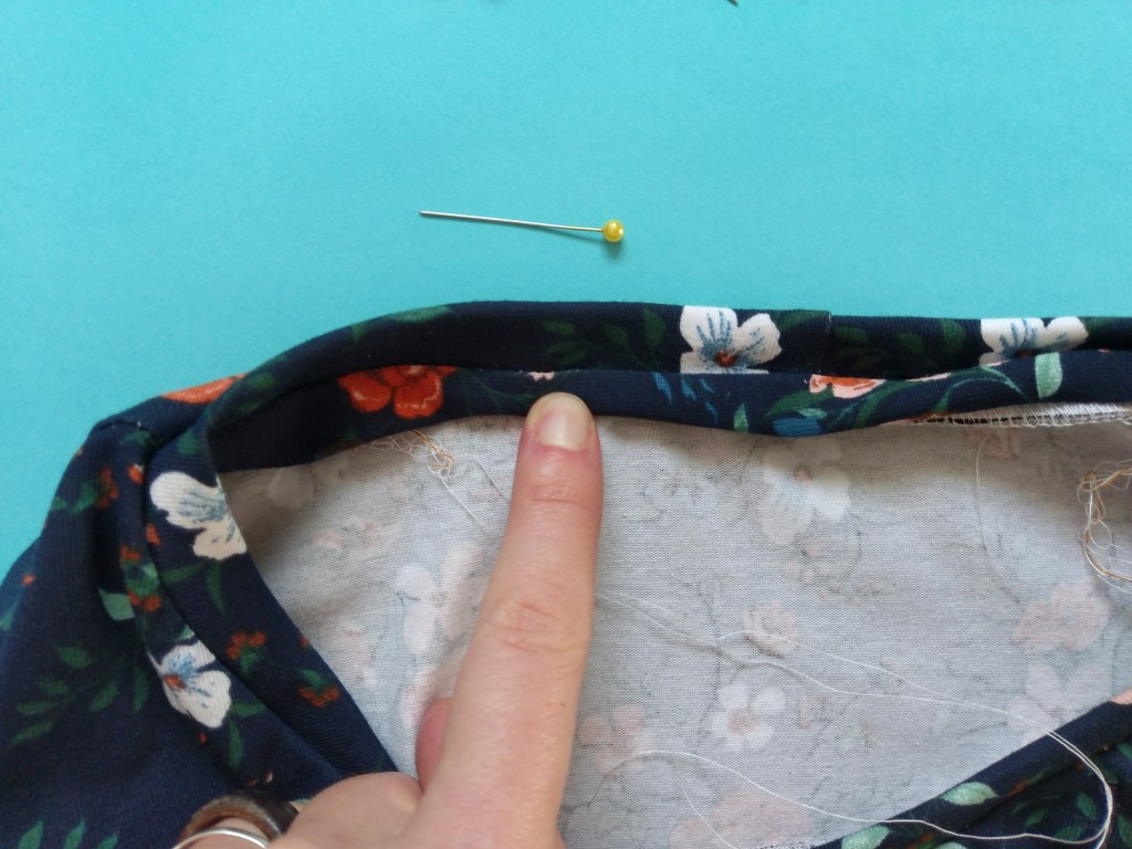 In einem Zug nähe ich das Halsbündchen und das Schrägband für die Nackenversäuberung fest.