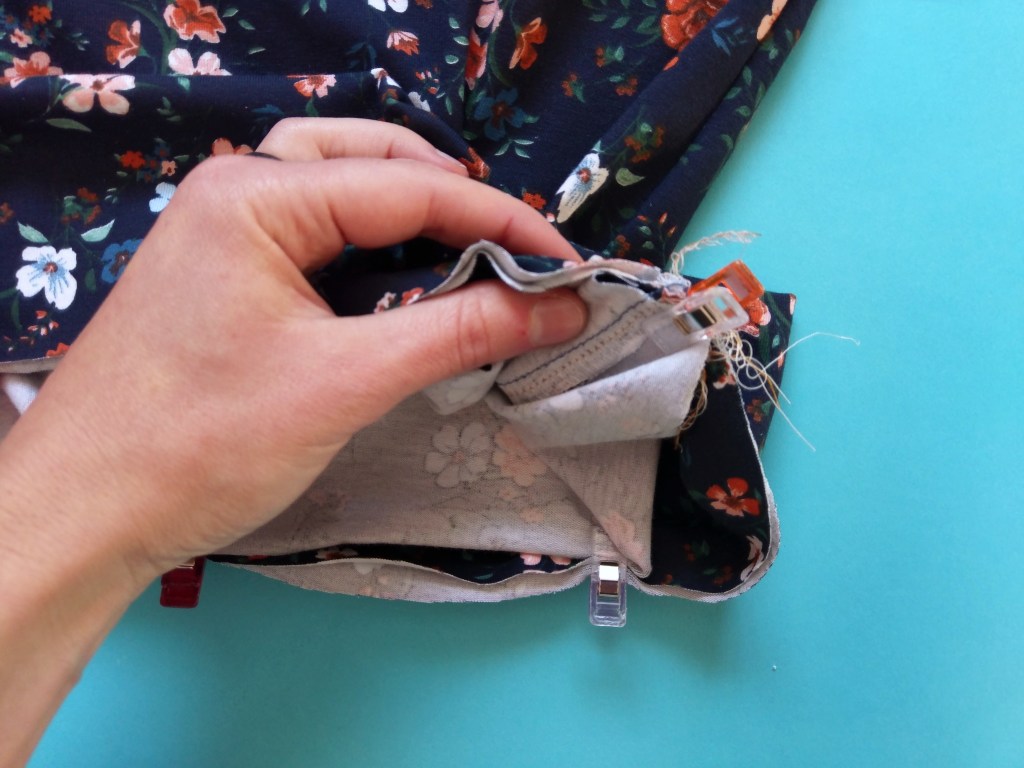 - Versäubern mit einem Zick-Zack Stich und einem elastischen geraden Stich, als zusätzliche Stabilität. Für ein sauberes Stichbild mit der Overlock – Nähmaschine alles versäubern.