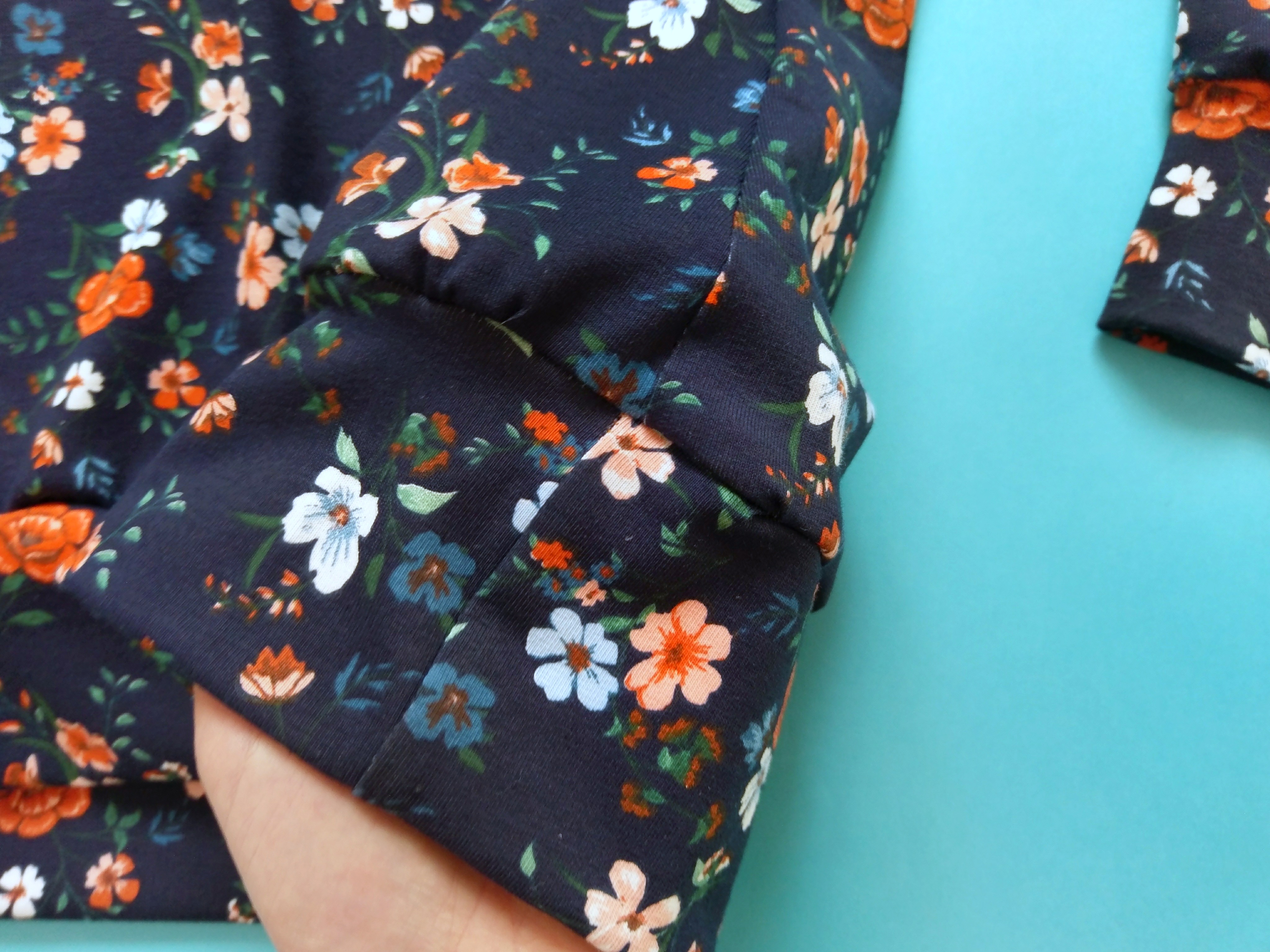 Das Armbündchen zu einem Ring schließen. Nun bis zur Hälfte auf die rechte Stoffseite wenden und rechts auf rechts an den Ärmelsaum stecken und festnähen.