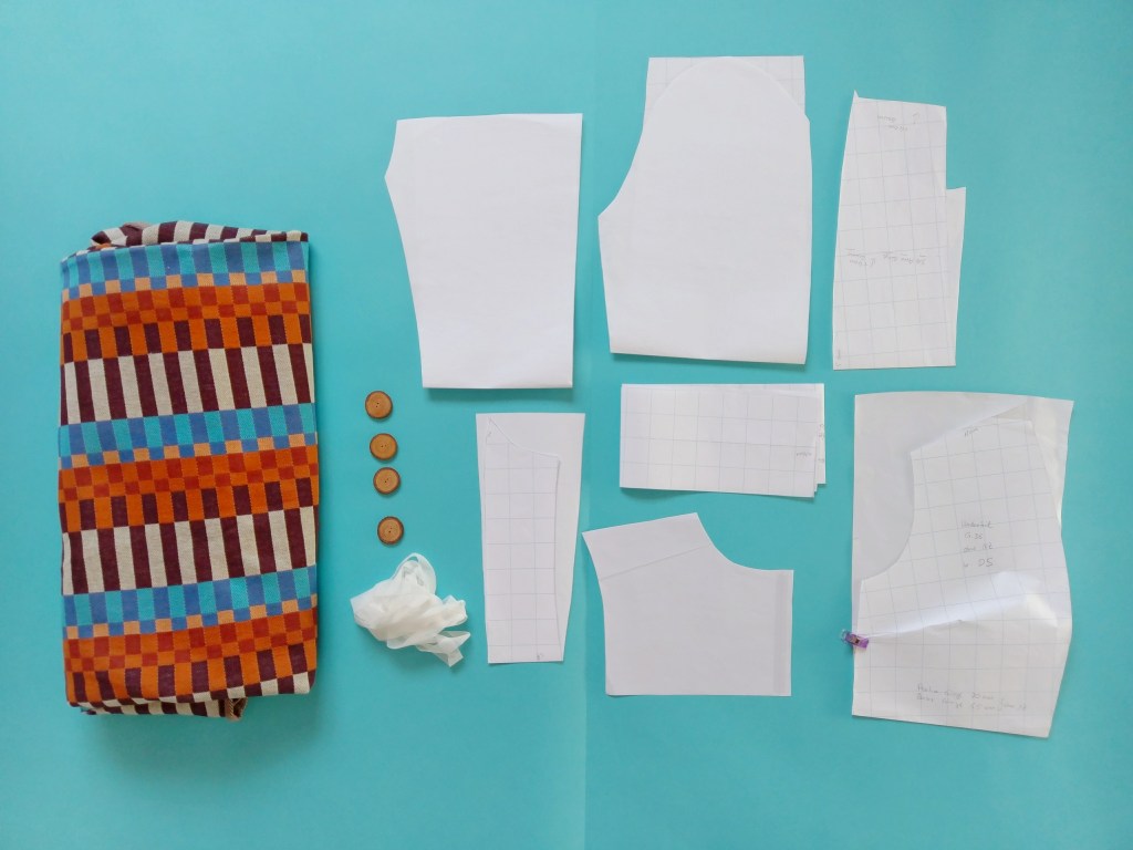 Du benötigst das Vorderteil, Rückenteil und seitliches Rückenteil, Schulterpasse, Ober- und Unterärmel, Blende, 4 Knöpfe ca. 2 cm Durchmesser, etwas Nahtband und den Stoff.
