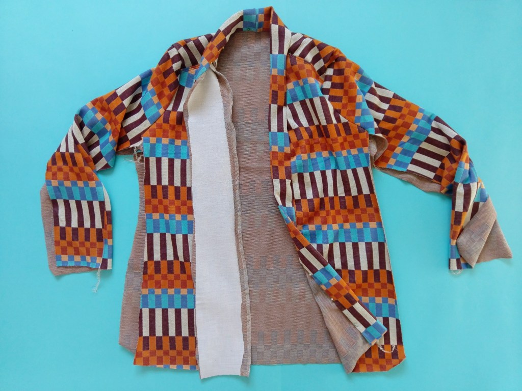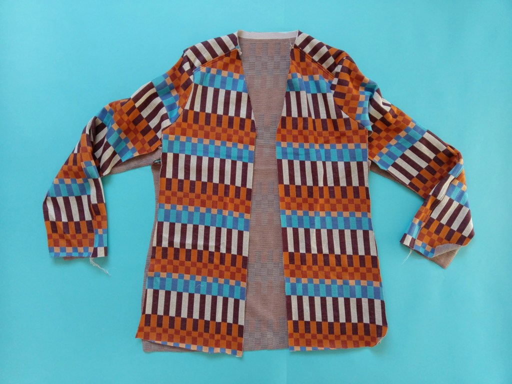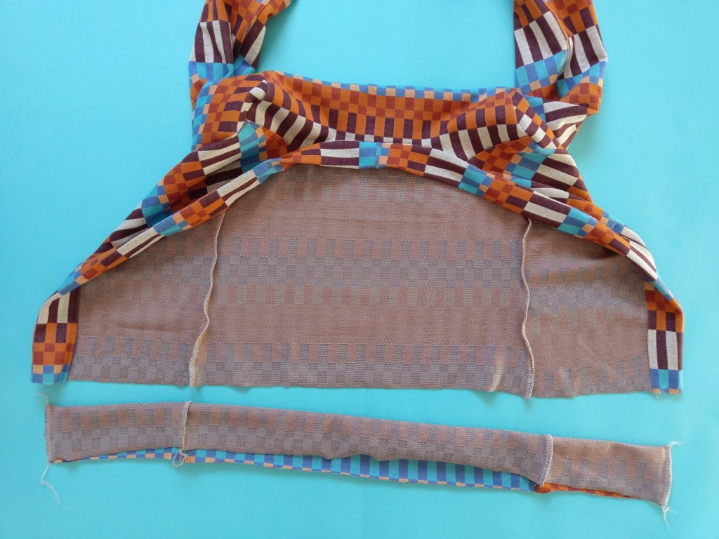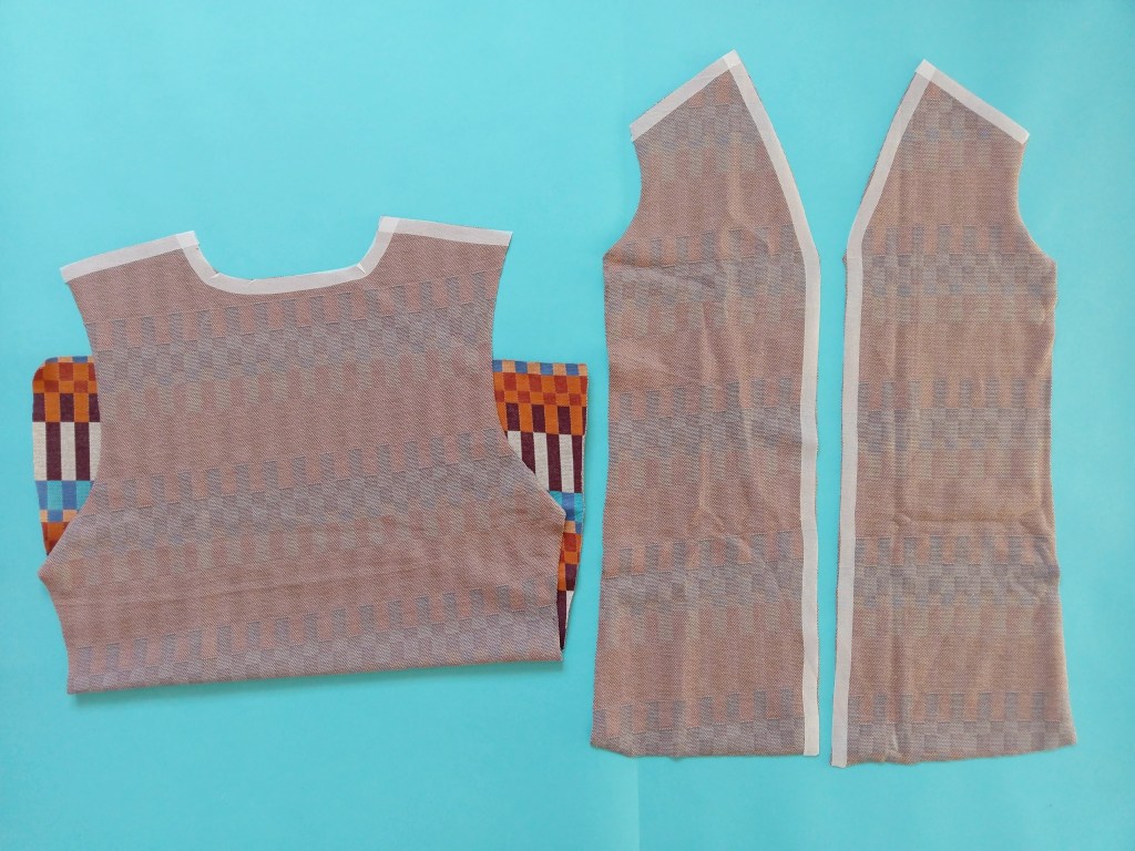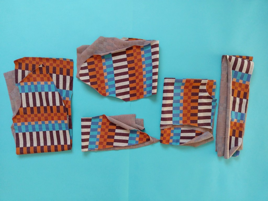 So sehen alle Schnittteile zugeschnitten aus. Das Rückenteil im Stoffbruch, 2 mal Oberärmel, 2 mal Unterärmel, 4 mal Blende, 2 mal Vorderteil.