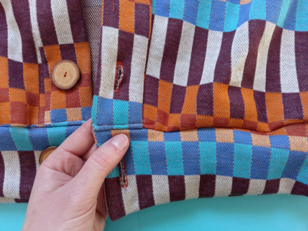 Die Nahtzugabe nach oben bügeln und mit einem geraden Stich, von der rechten Stoffseite, auf der Blende festnähen. Zum Schluss noch die Knopflöcher nähen wie in der Nähanleitung bei KÄTHE beschrieben.
