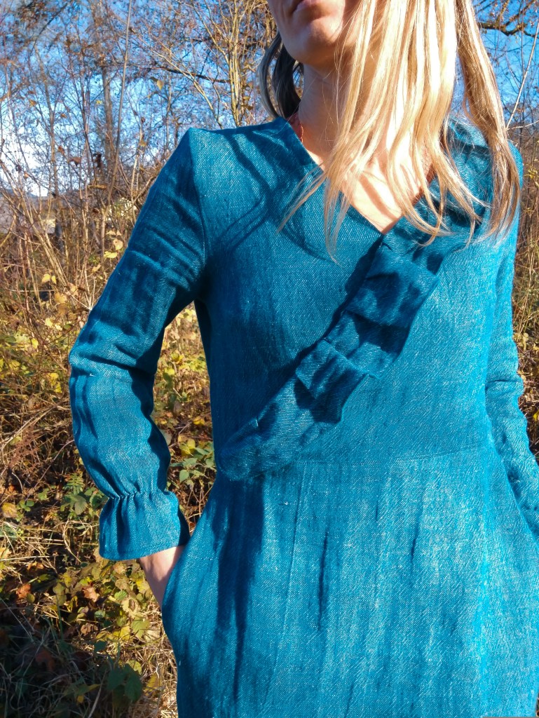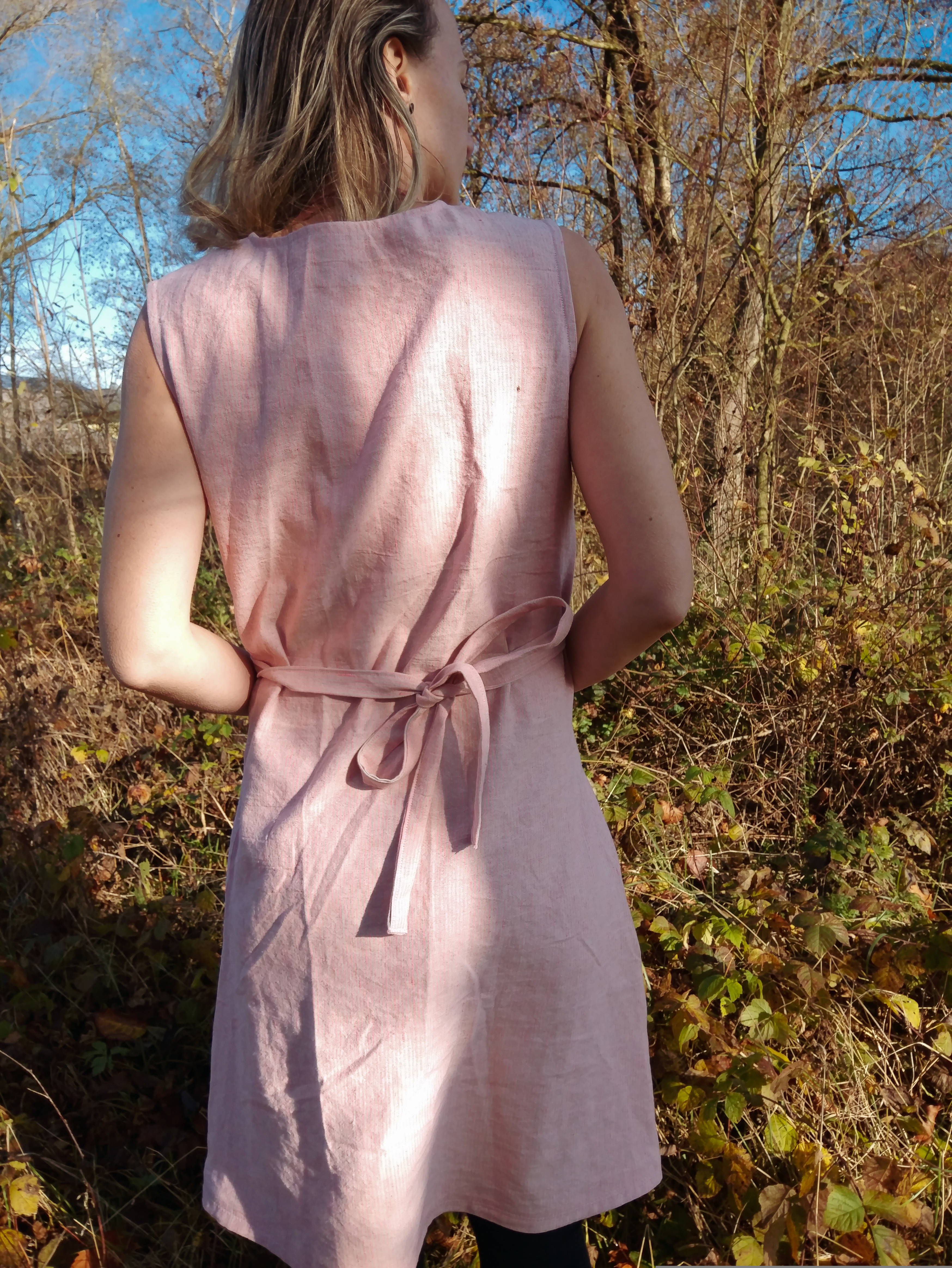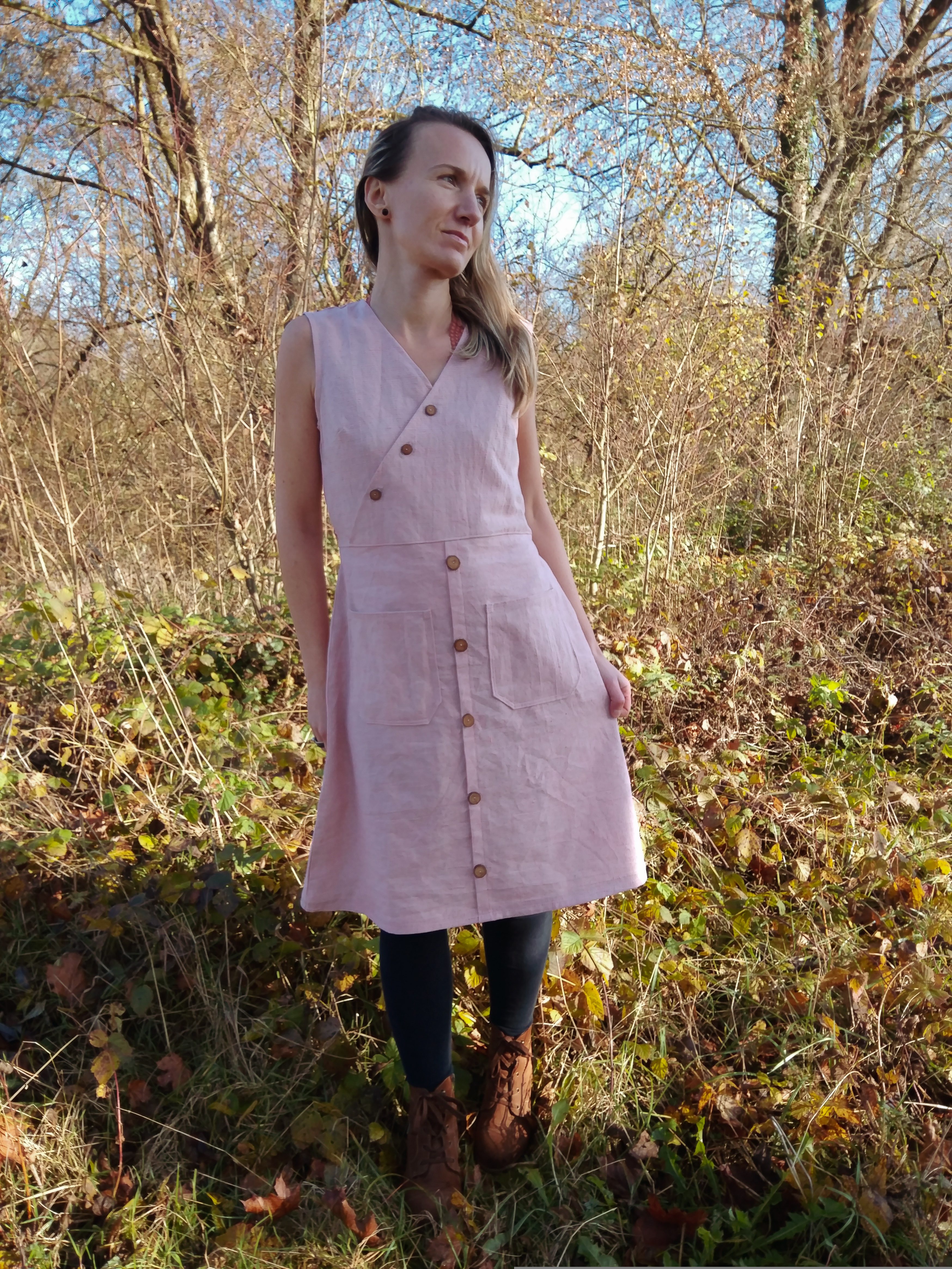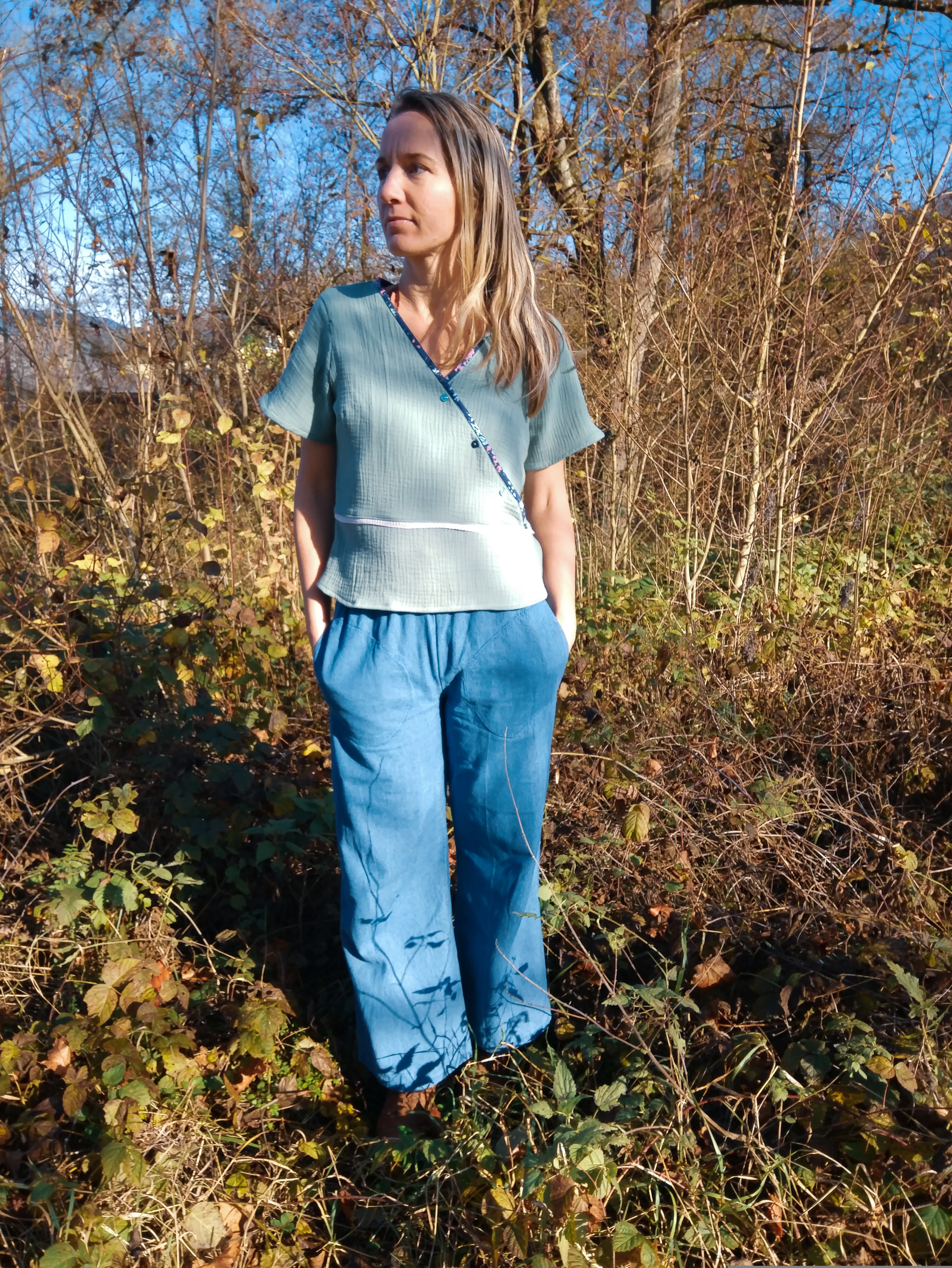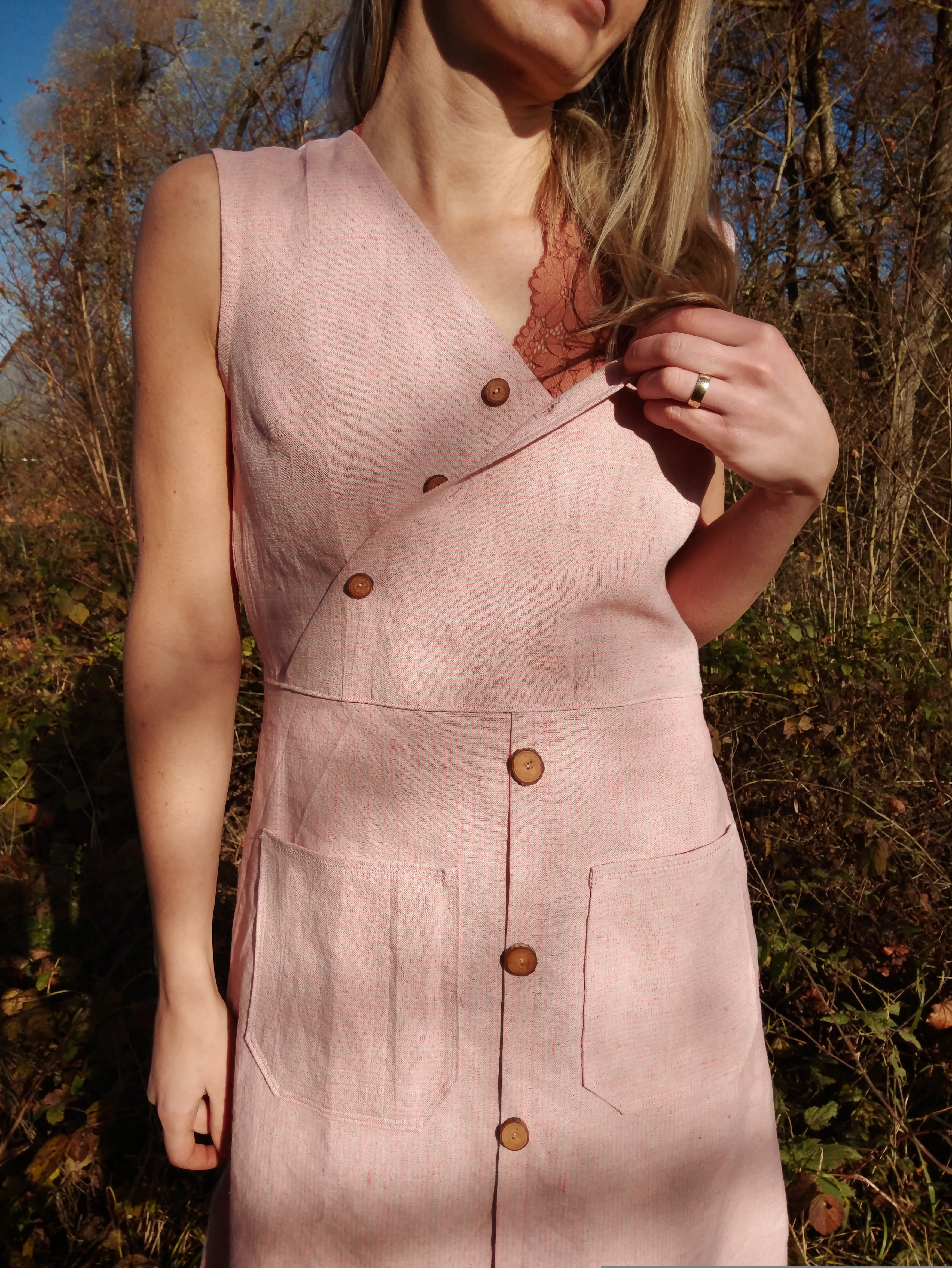 Stolz zeige ich euch meine Wickelkleid Varianten. Ich habe mich bei der Variante 1 (blaues Kleid) für einen Leinen- Baumwollstoff entschieden. Er ist ca. 250 gr. schwer. Bei der Variante 2 (rosa Kleid) habe ich mich für einen 100 % Leinenstoff entschieden der kleine weiße Streifen hat. Für die Variante 3 (Bluse) habe ich einen mint- farbenen Musselinstoff vernäht, den ich im Sommer 2020 bereits für meine Damenhose SILJA genommen hatte. Bei der Blusenvariante eignen sich hervorragend Reststoffe. Das ist super den damit ist die Bluse eine sehr Nachhaltige Nähvariante.