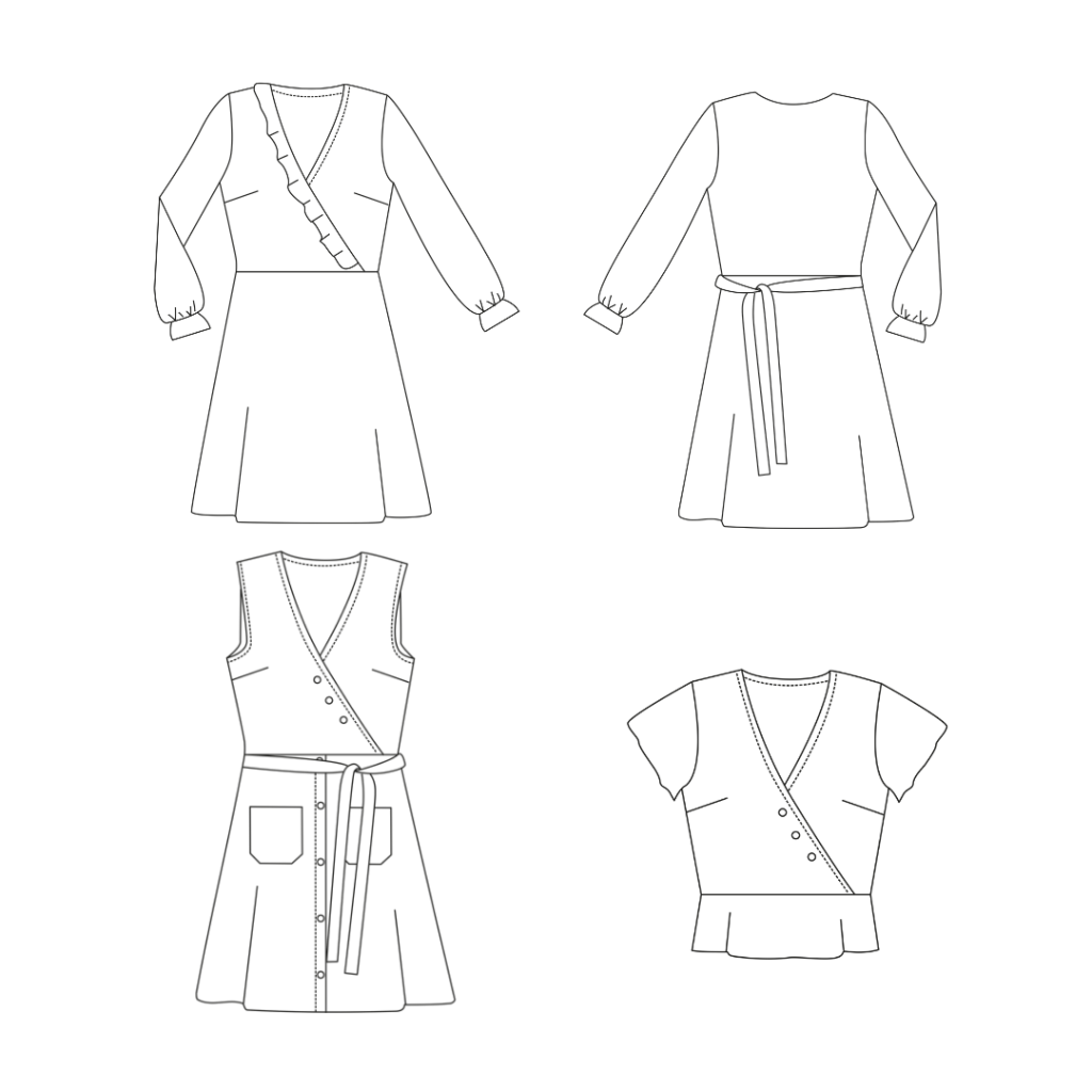 - 3 Ausschnittvarianten, 4 Armlängen, 2 Taschenformen, 2 Rockvarianten, Bindegürtel und eine ausführliche Beschreibung wie das Kleid auf Midilänge angepasst werden kann.