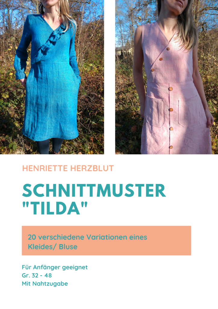 Der Halsausschnitt kann mit einer Volantrüsche, Knopfleiste zum öffnen oder ganz ohne Schnick Schnack genäht werden. Der Bindegürtel passt sich jeder Taille perfekt an, das Kleid kann aber auch ohne getragen werden. Schnittmuster TILDA kann mit einer versteckten Nahttasche oder einer aufgesetzten Tasche genäht werden. Bei der Variante 3 erwartet dich eine Blusenvariante. Wie du dir das Schnittmuster zur einer Bluse anpassen kannst, wird in der Nähanleitung ganz genau beschrieben. Ich zeige dir auch, wie du deine Bluse mit einem süßen Volantärmel nähen kannst. Dazu muss das Schnittmuster an einigen Stellen aufgeschnitten werden und es wird Mehrweite eingefügt. Aber auch das, wird Schritt für Schritt in der Nähanleitung erklärt.