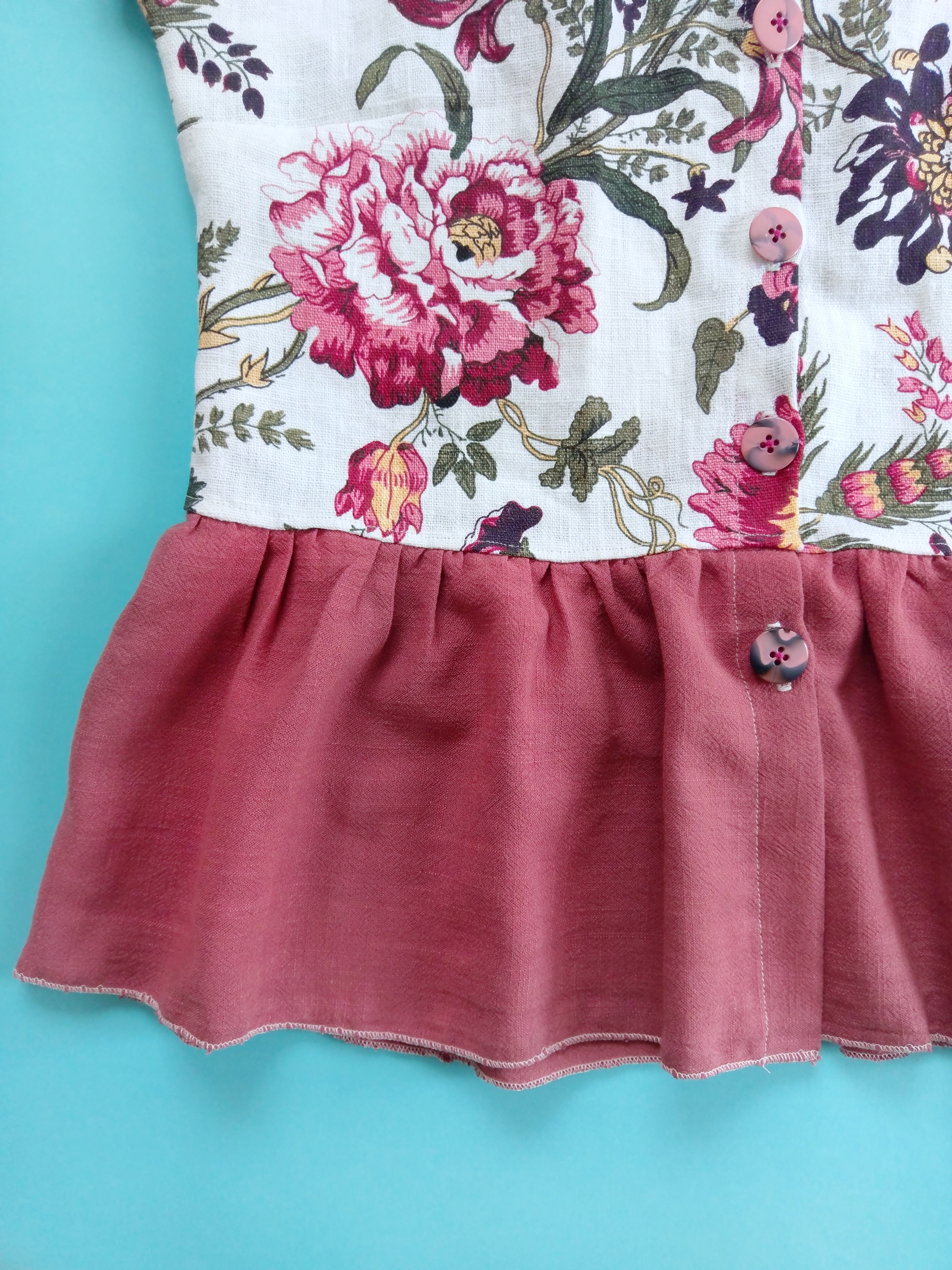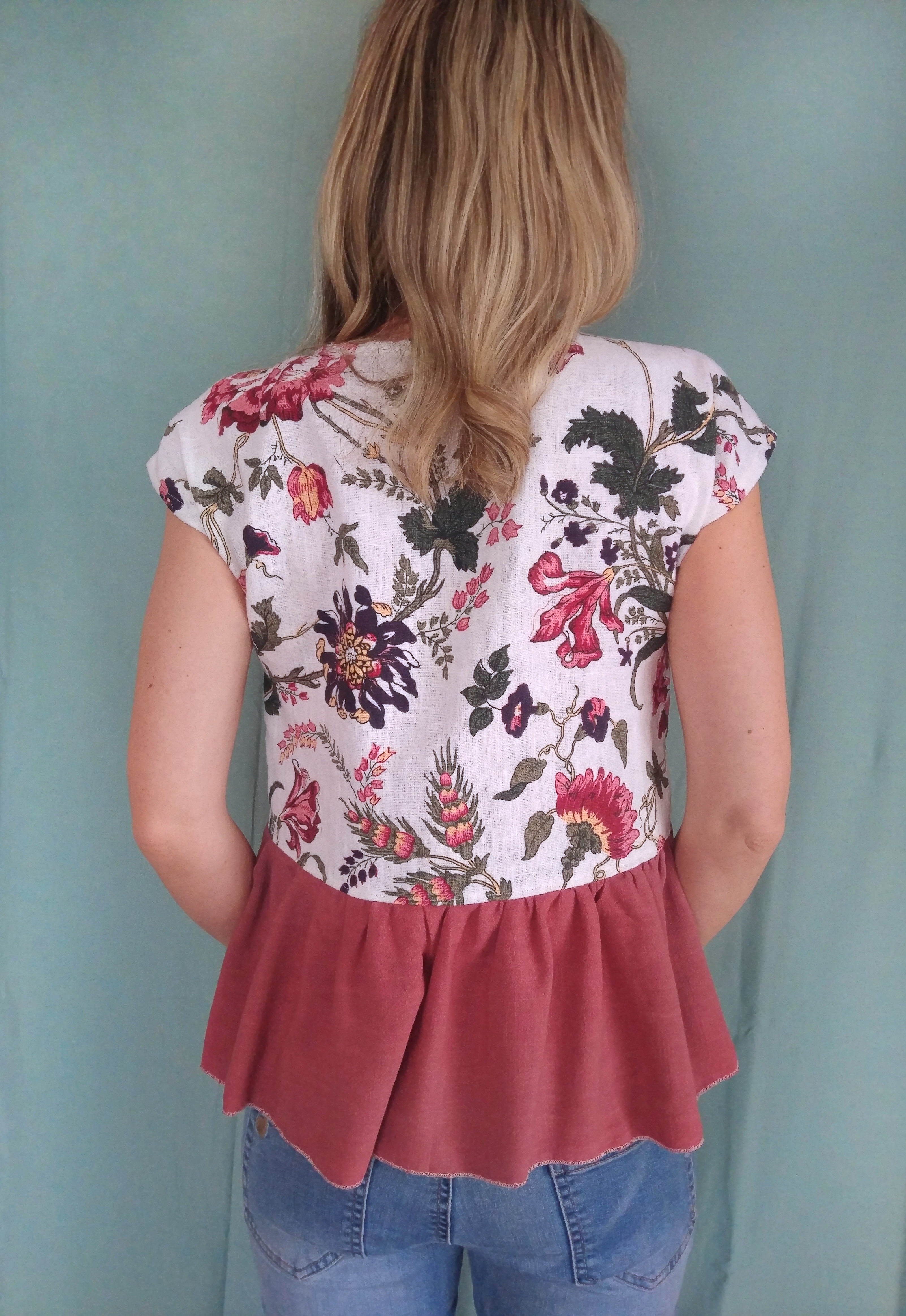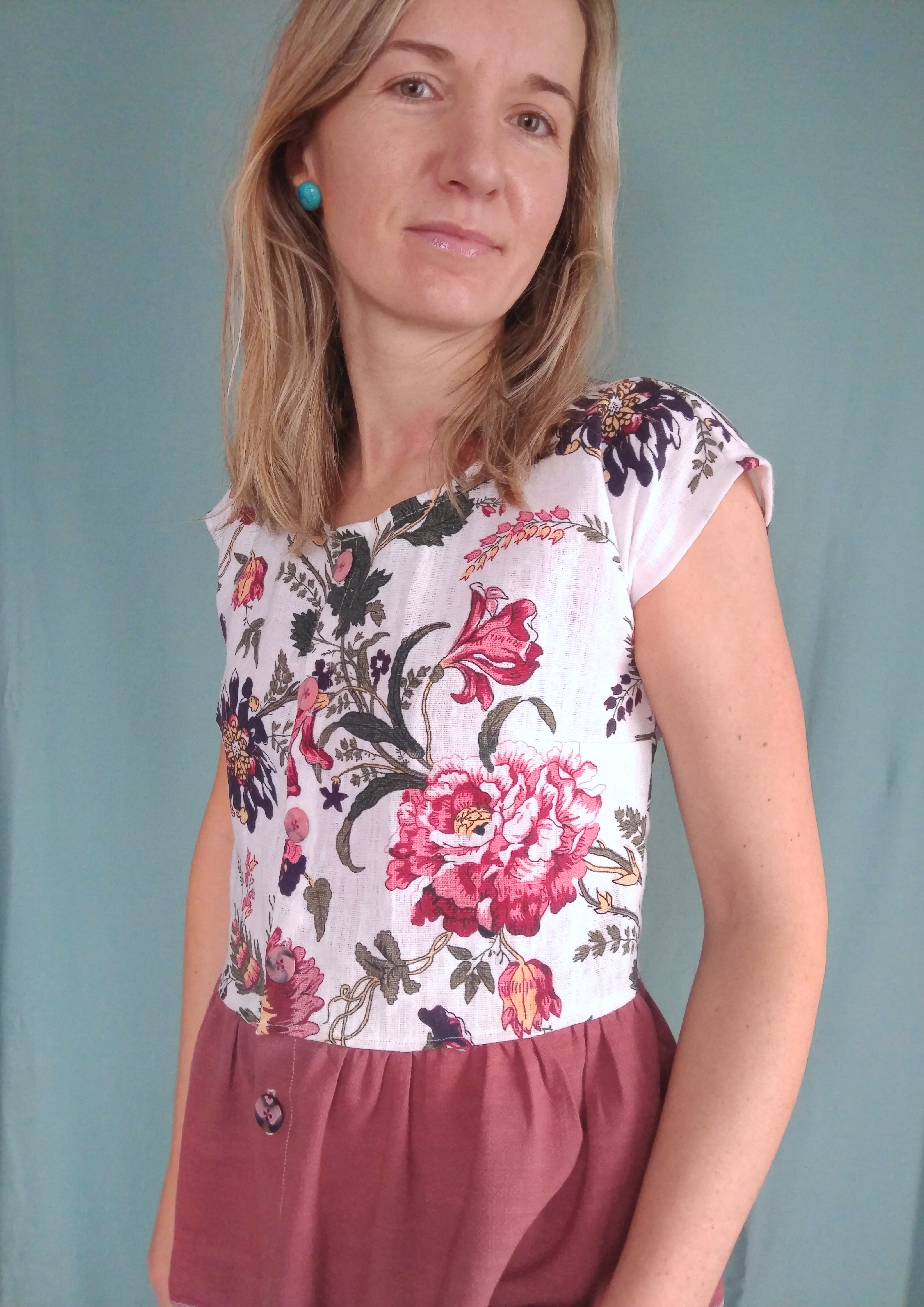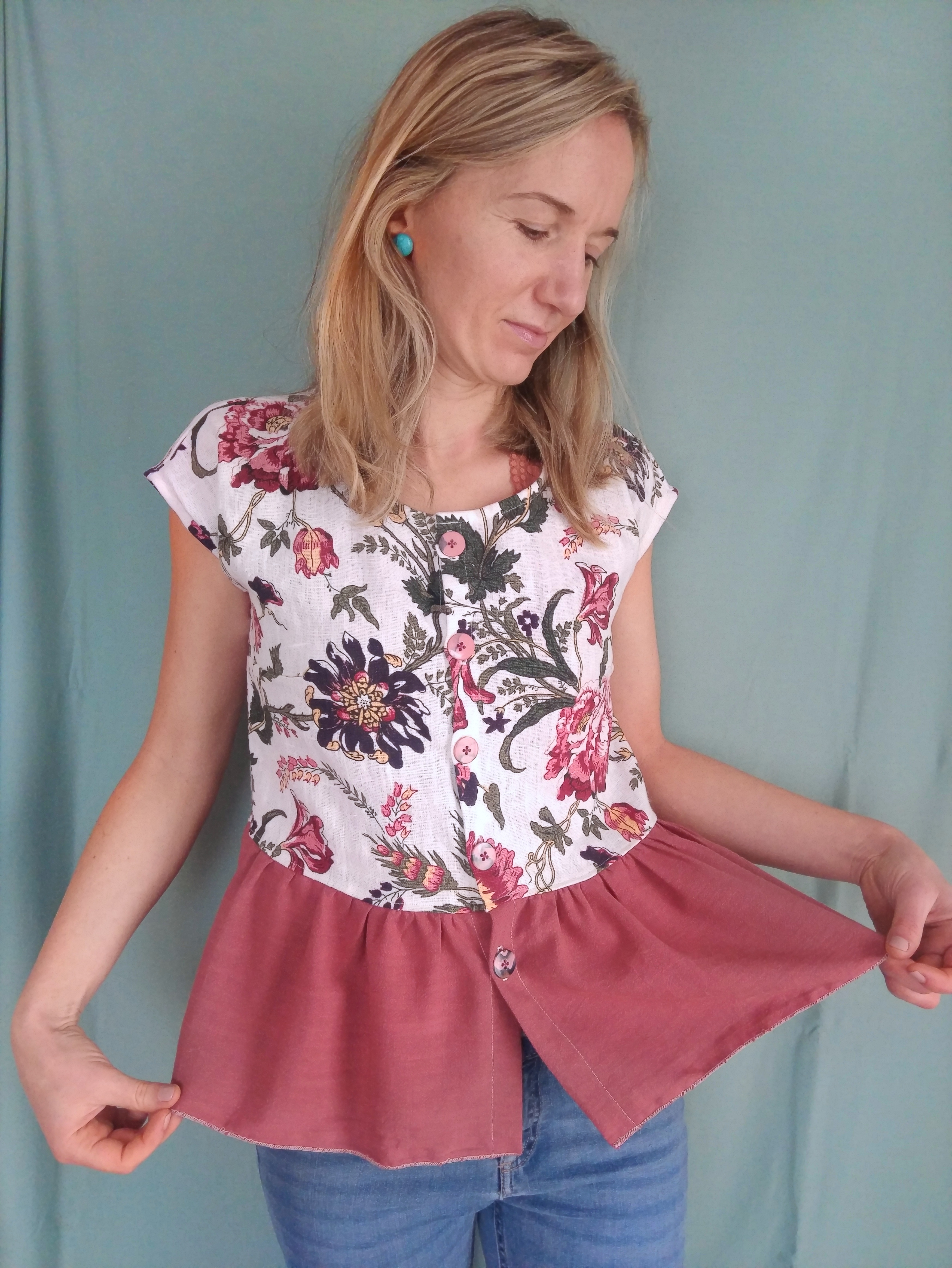 Mit dieser kostenlosen Nähinspiration möchte ich dir zeigen wie wandelbar und vielseitig meine Schnittmuster sind. Eine Bluse nähen lernen ist nicht schwer, es sind nur ein paar Änderungen am Schnitt nötig um ein ganz anders Kleidungsstück zu erhalten. Die Bluse ist schön luftig und locker, wenn du das Schößchen etwas länger nähst, erhältst du eine süße Damentunika. Diese kann im Frühjahr und Sommer perfekt mit Leggings getragen werden. Die Bluse hat einen Kimono Ärmel der die Schultern bedeckt. Zwei Brustabnäher geben der Leinenbluse eine feminine Silhouette. Du benötigst das Vorderteil in doppelter Stofflage, das Rückenteil im Stoffbruch, beide Rockteile die gekürzt werden müssen. Das Rückenteil wird im Stoffbruch um 1 cm schmaler zugeschnitten, so liegt die Bluse etwas enger an. Für die Bluse wird eine „richtige“ Knopfleiste genäht, aber keine Sorge, das ist nicht schwer. In der Nähanleitung bei ALMA wird alles ganz genau beschrieben. Der gekürzte Rockteil wird bei der Bluse ebenfalls gekräuselt. Die Damenbluse ist damit perfekt für Nähanfänger und jeden der „noch auf die schnelle“ ein bezauberndes Kleidungsstück nähen möchte.👚Das ideale Nähprojekt für langweilige Corona Tage.