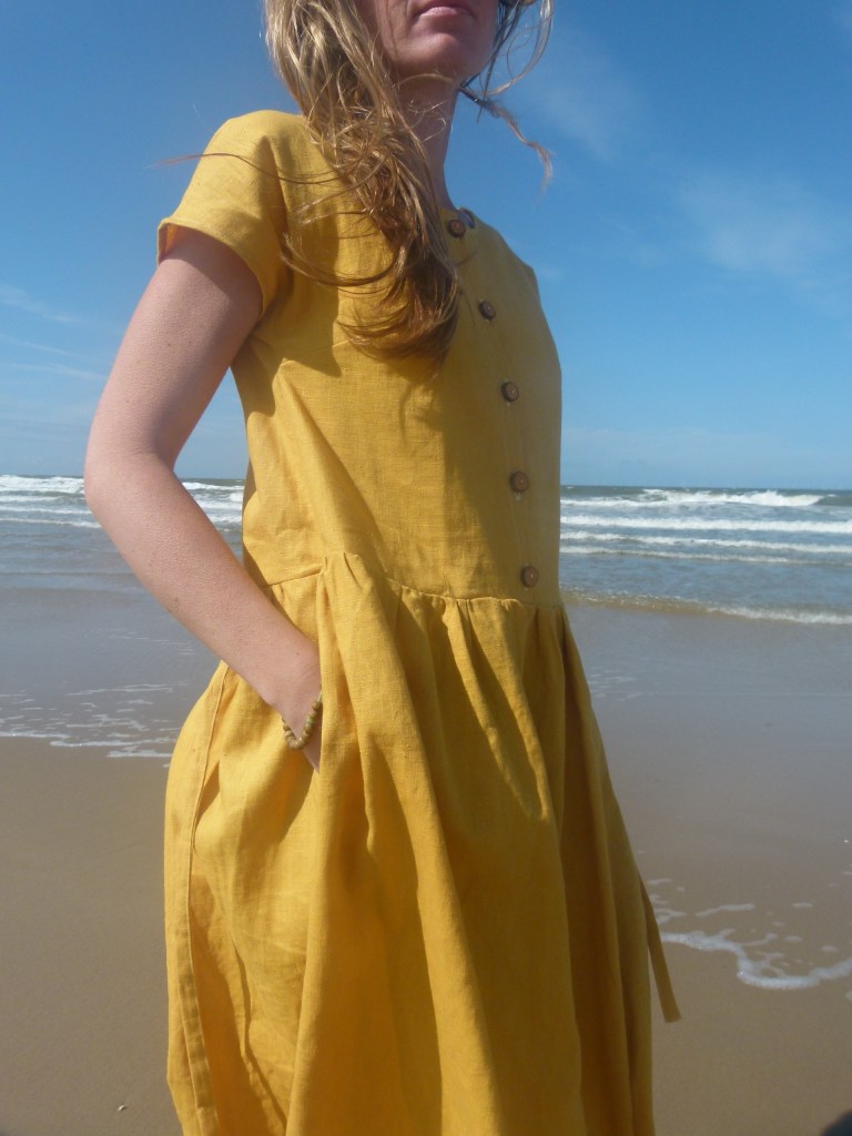 Das Damenkleid kann in 20 verschiedenen Varianten genäht werden. Mit Knopfleiste zum Öffnen im Vorderteil ist es ideal für „stillende Mütter“. Das Vorderteil kann auch ohne Knopfleiste genäht werden. Die Bindegürtel im Rücken passen sich jeder Taille und Hüfte perfekt an. Du hast die Wahl zwischen Kurzarm, 3/4 Arm oder Langarm. Es stehen zwei Taschenformen zur Auswahl und der Rockteil kann in zwei Längen genäht werden. Ebenso hast du die Möglichkeit eine Zierknopfleiste in den vorderen Rockteil einzunähen. Kleid ALMA hat einen angeschnittenen Arm, einen bequemen Rundhalsausschnitt wodurch das Kleid über den Kopf an und ausgezogen werden kann. Eine süße gekräuselte Taille die die Hüften umspielt. Das Schnittmuster ist für Webstoffe ausgelegt, speziell für Leinenstoffe. Am besten nimmst du 100 % reinen Leinenstoff, blickdicht und mit weichem Fall. Ich empfehle ca. 180 g – 220 g schwere Leinenstoffe. Bei welchem Stoffhändler ihr wunderbare Leinenstoffe bekommt, steht am Ende jeder Nähanleitung, in der „Händlerliste„.