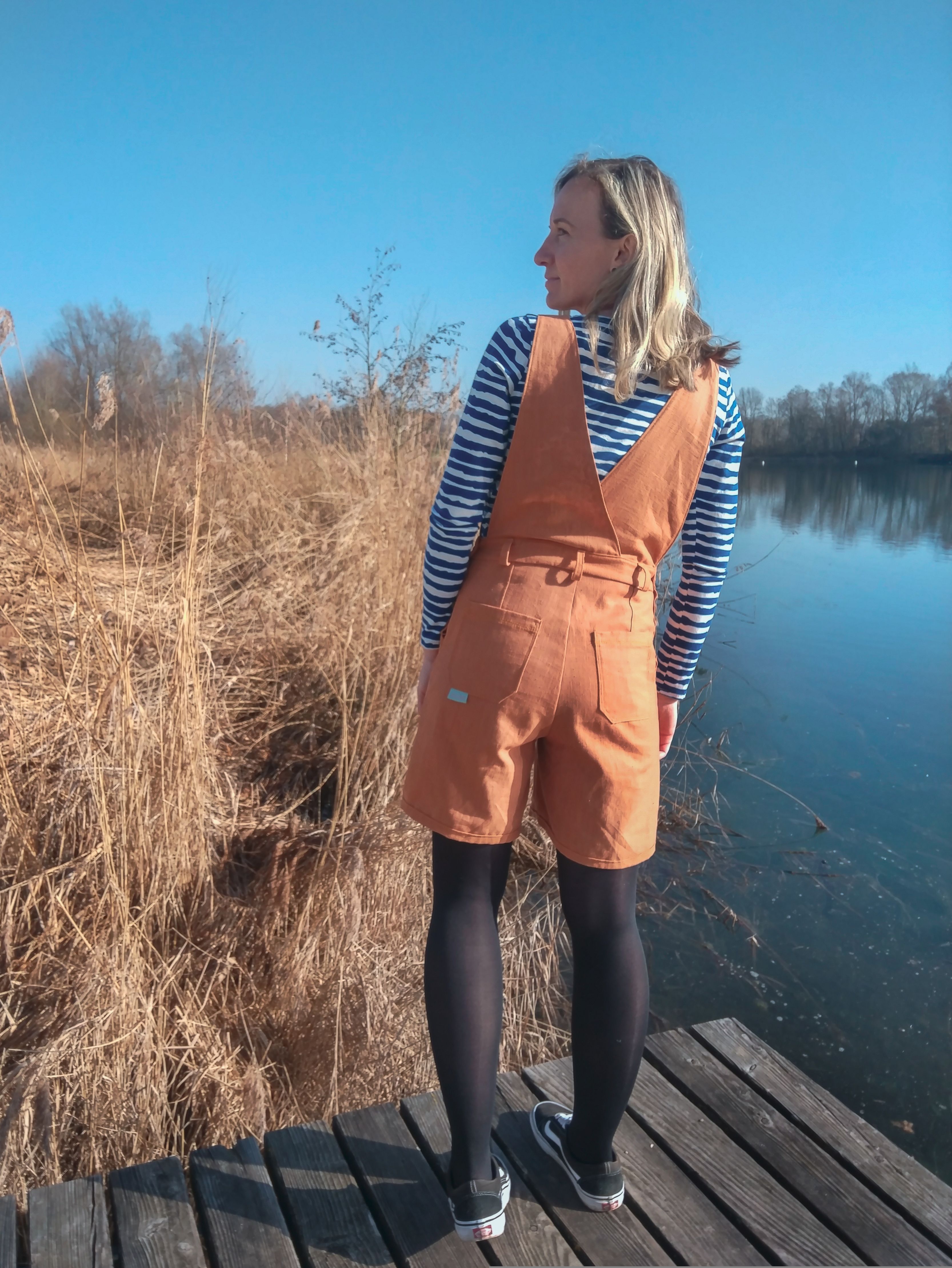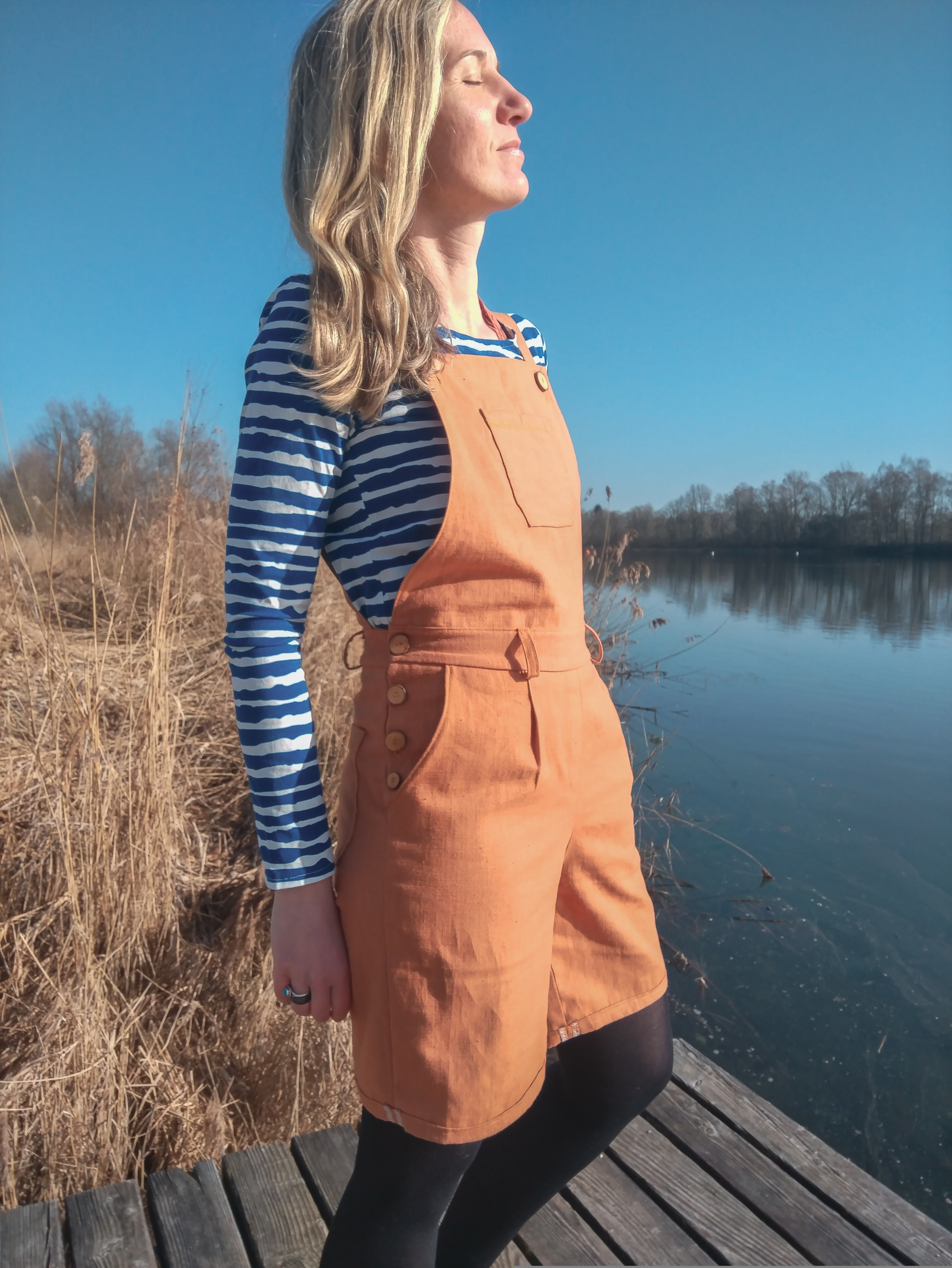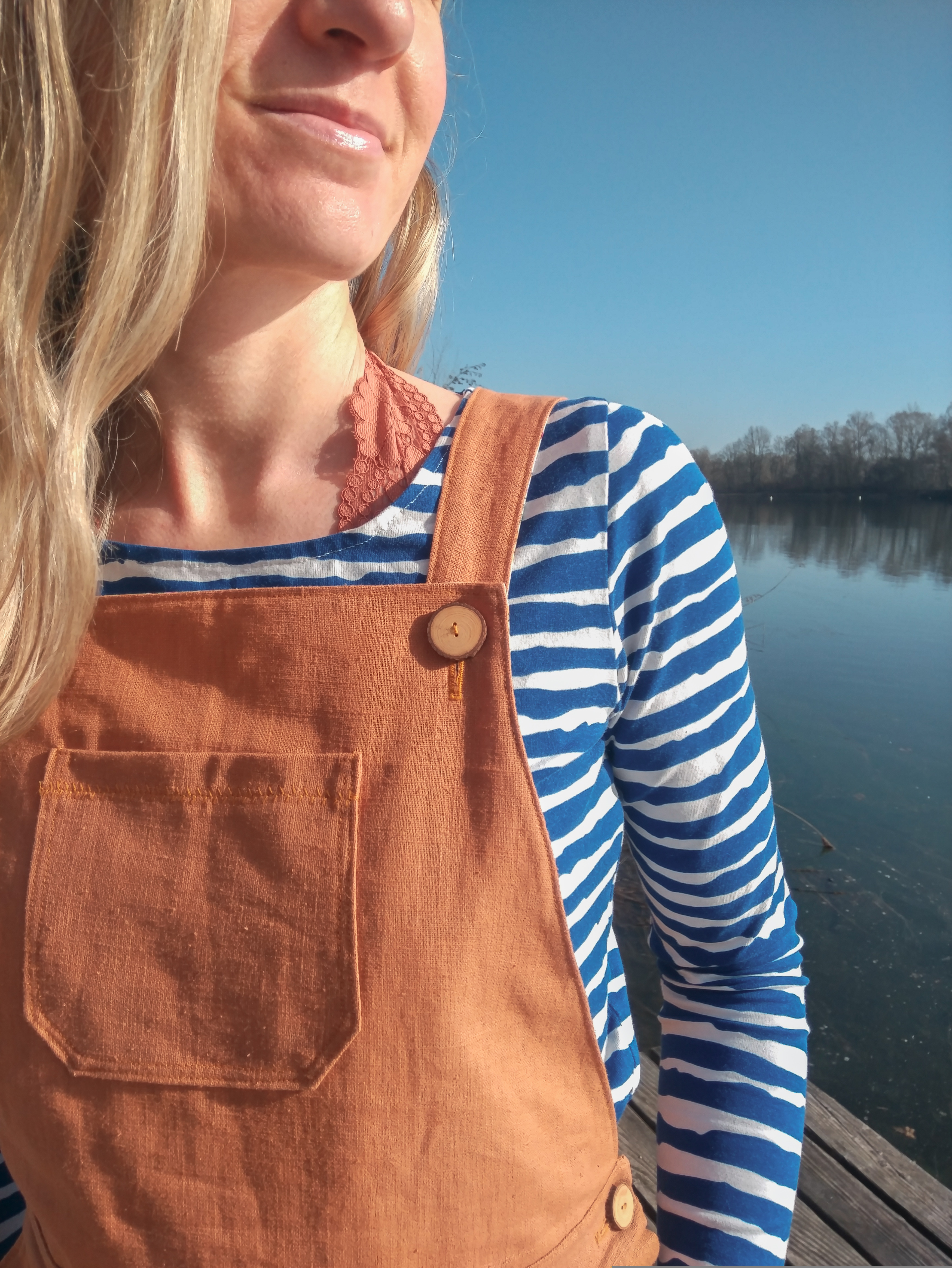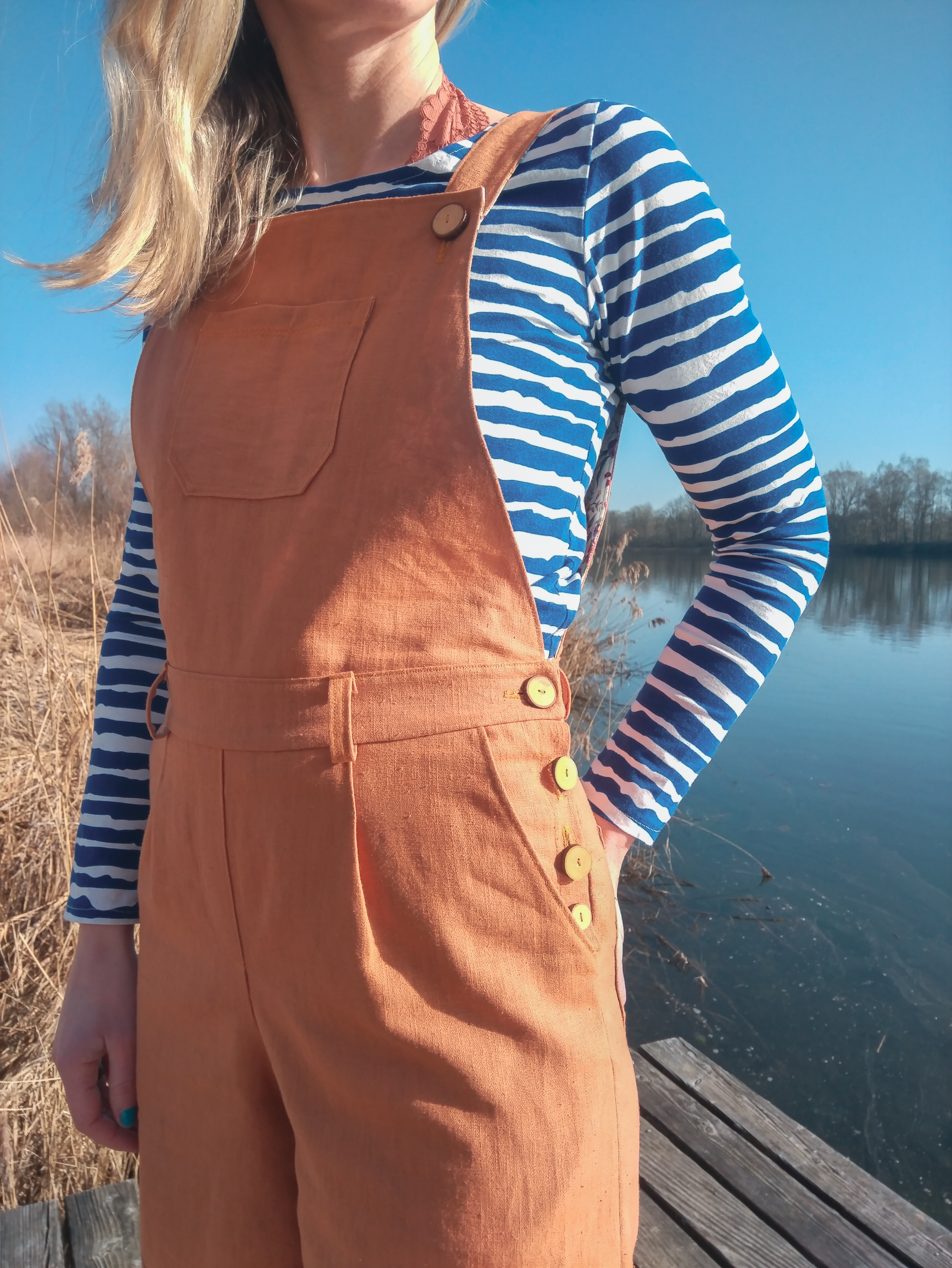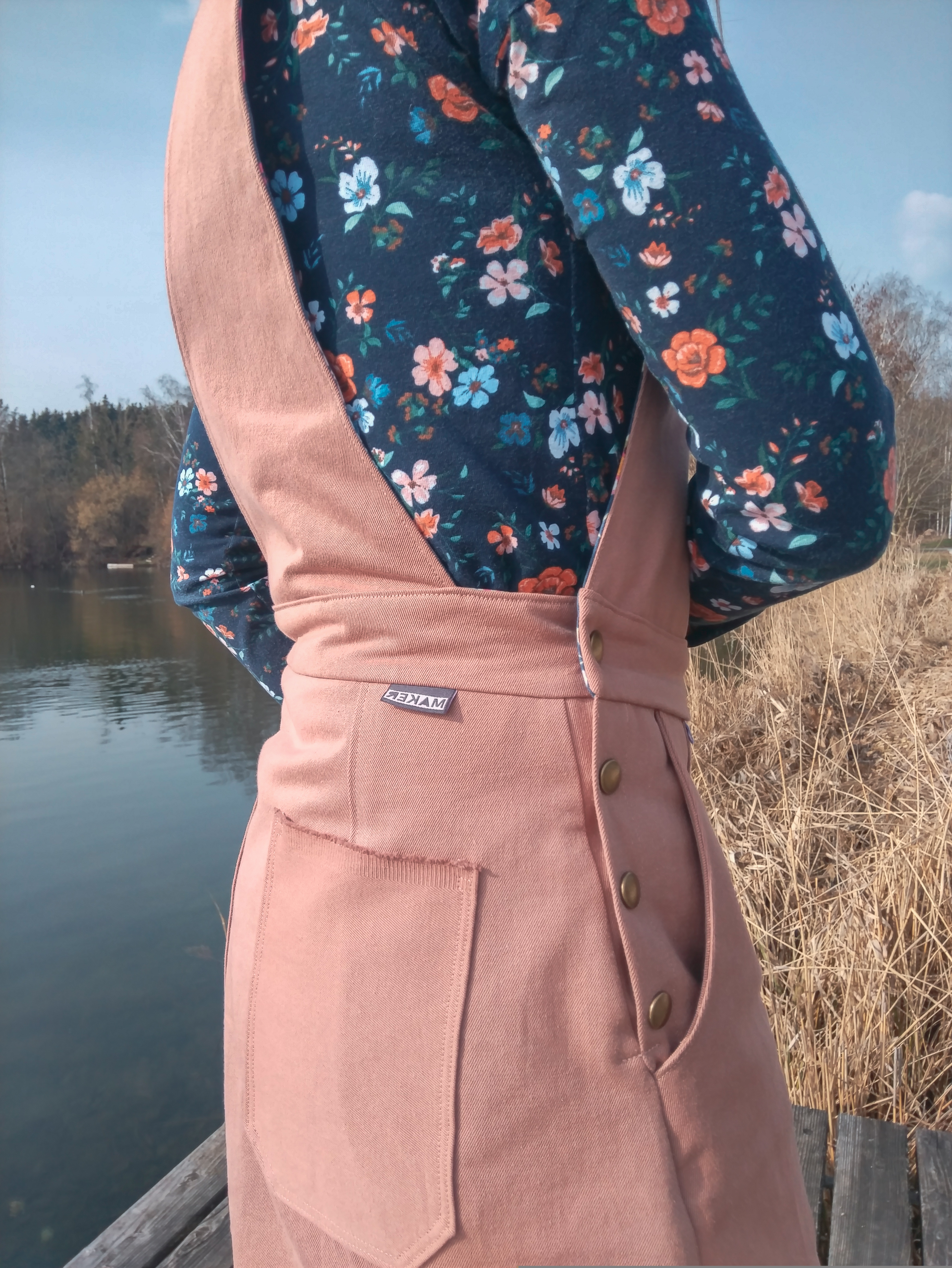Natürlich möchte ich euch Bilder meiner JONNA nicht vorenthalten. Ich habe sowohl das Latzkleid als auch die Latzhose in der Größe 36 genäht, ohne Anpassungen und genau nach Schnittmuster. Für die Latzhose habe ich einen Rostfarbenen Leinenstoff genommen, ca. 24o gr. schwer und für das Latzkleid habe ich einen roséfarbenen Jeansstoff genommen, ca. 250 gr. schwer.