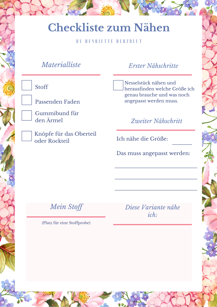 Um dir das Nähen etwas zu erleichtern und organisieren, habe ich euch eine Checkliste erstellt. Es ist eine kostenlose A4 Datei die auf jedem Drucker ausgedruckt werden kann.