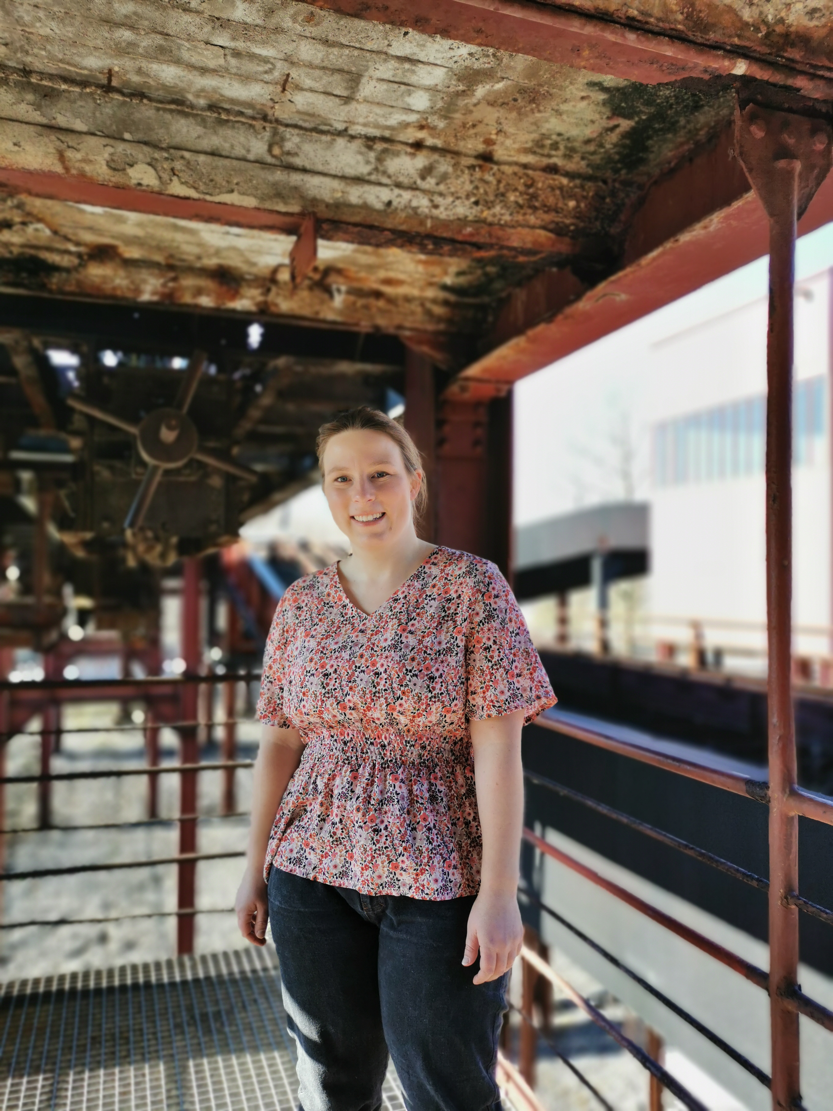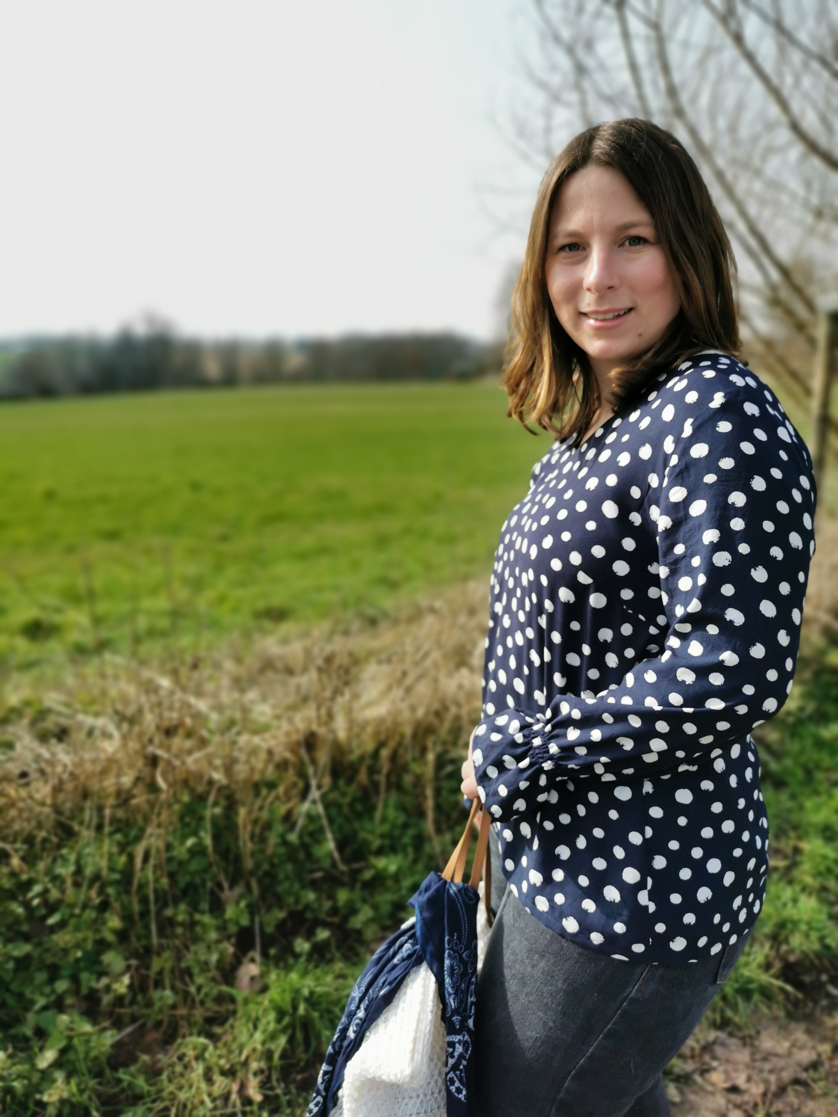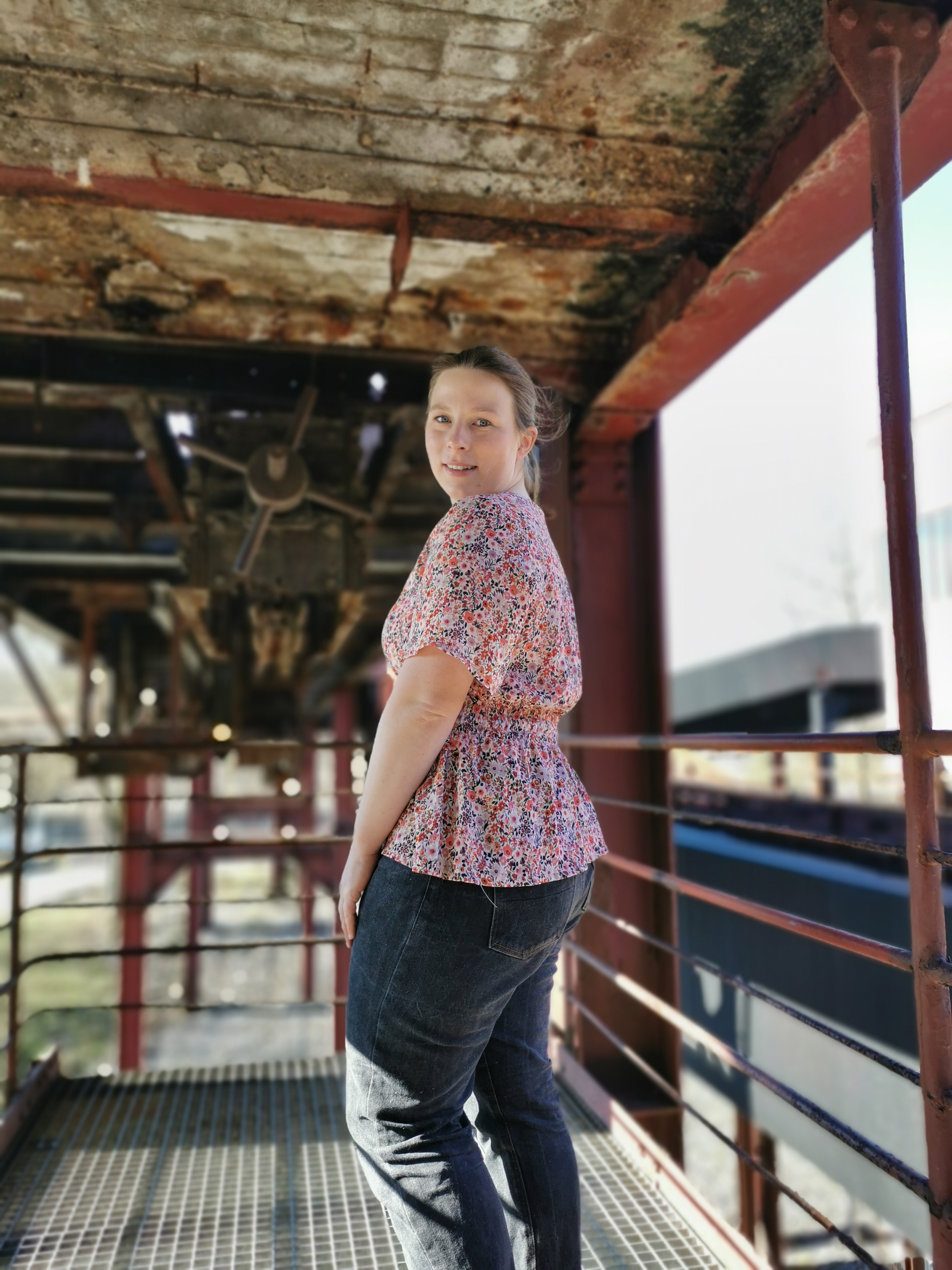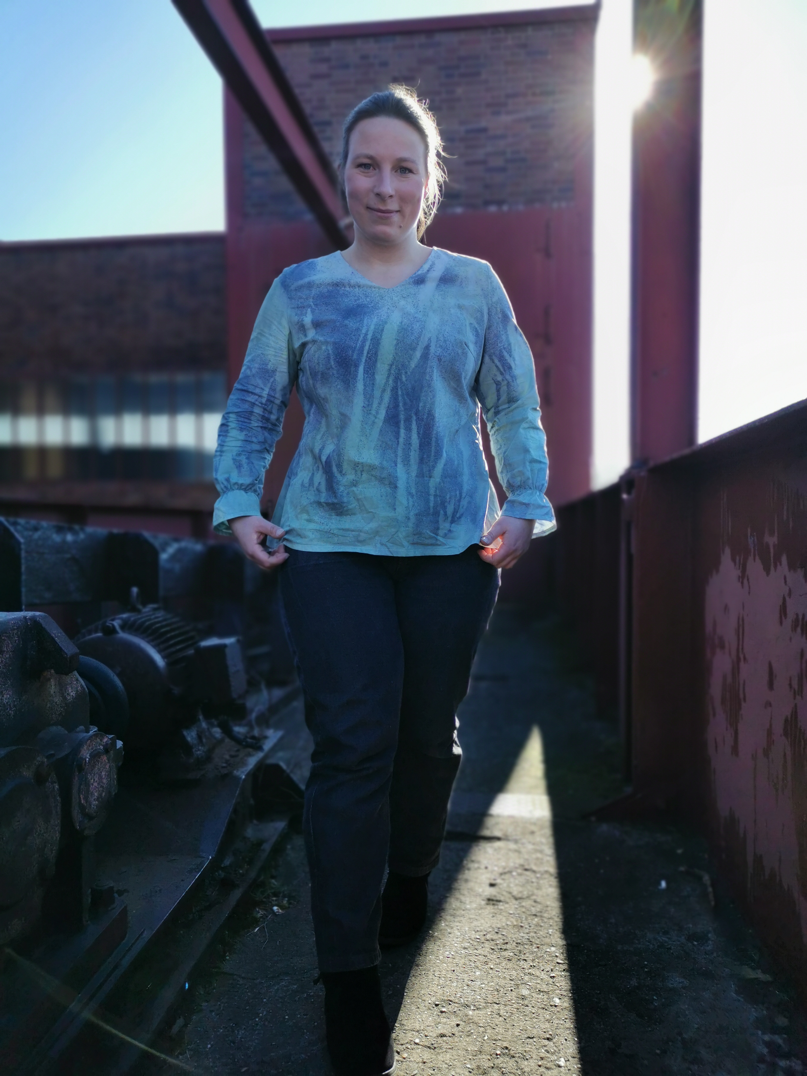 TILDA hat mich schon von Anfang an interessiert. Ich liebe eigentlich Wickelkleider, ziehe sie aber so ungern an, weil der Ausschnitt immer so groß ist. Die Lösung bei Tilda mit einer Wickeloptik nur im Vorderteil hat mir direkt gefallen. Zum Probenähen habe ich mich durch meine Masterarbeit nicht gemeldet und hinterher war ich so vertieft ins Blusen nähen für meinen Berufsstart, das kein Kleid in meine Näh- Pläne gepasst hätte. Dann kam mir aber die Idee, Tilda als Bluse mit schönem V-Ausschnitt umzusetzen, um sie so bürotauglich zu machen. Der lockere Fall und die kleinen Details für die Ärmel machen sie dafür perfekt.