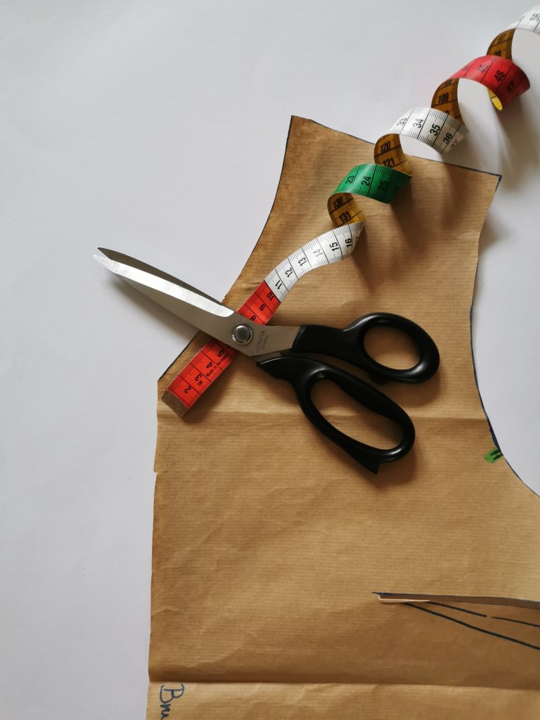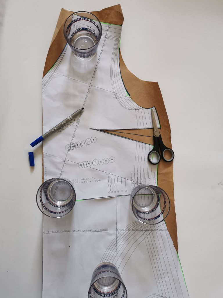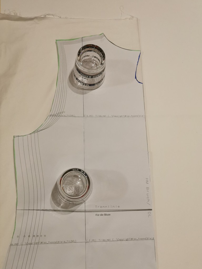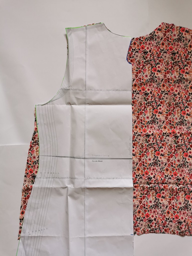 tiefer und lassen den Tropfenausschnitt weg. Da ich die Taille smoken möchte, schneide ich den Stoff ab unterhalb der Brustabnäher beim Vorderteil und Rückteil in einer A-Linie aus. So habe ich dort hinterher mehr Stoff zum Kräuseln und verstärke den Effekt.