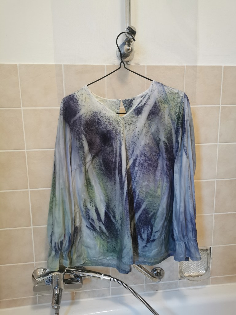 Zum Schluss kommt der spaßige Teil an der ganzen Sache….🥳 Ich habe meine Bluse in der Badewanne angefeuchtet und mit Batikfarbe bestreut.