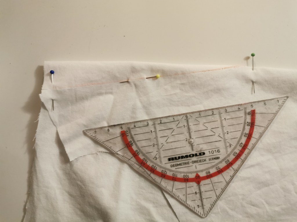 um einen Zentimeter umschlagen, gut gebügelt und dann festgesteppt.