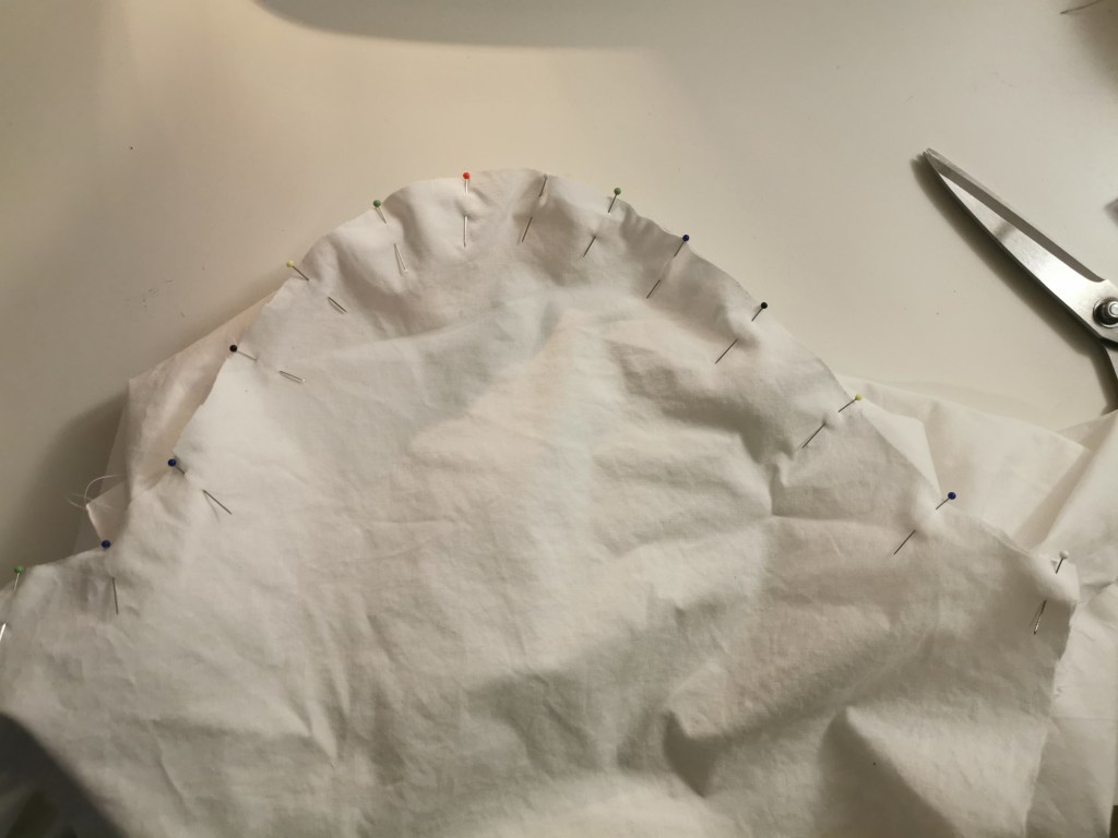 Jetzt lege ich den Beleg rechts auf rechts auf den Ausschnitt. Auf die rechte Seite des Tropfenausschnitt packe ich zwischen die beiden Stofflagen eine kleine Schlaufe aus Gummi (wahlweise auch Stoff möglich). Sie schaut nach innen und ich nähe innerhalb des Knoten, damit sie