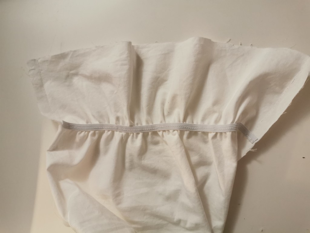 Anleitung beschrieben, entschieden. Anstatt eines einzelnen Gummis könnte hier auch mittels Smoken der Ärmel gerafft werden.