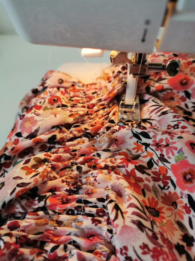 Schließlich markiere ich mir die Taille auf Vorder- und Rückteil und nähe dort meine erste Smokenaht. Am Anfang und Ende könnt ihr je nach Gummi gegeben falls nicht verriegeln und müsst deswegen knoten. Bei mir hat es funktioniert und der Gummi ist nicht gerissen oder reingerutscht. Ich habe rechts und links der ersten Naht jeweils im Abstand von 1,2 Zentimeter jeweils zwei weitere Nähte gesetzt.