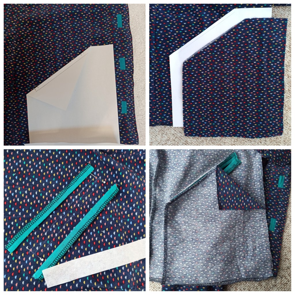 So kam mir spontan die Idee für eine andere Taschenlösung: Paspeltaschen mit schrägem Eingriff, das greift die Optik der Knopflöcher nochmal auf. Die Position der Schlitze und die Taschenbeutel habe ich einfach mit einem A4 Blatt konstituiert.