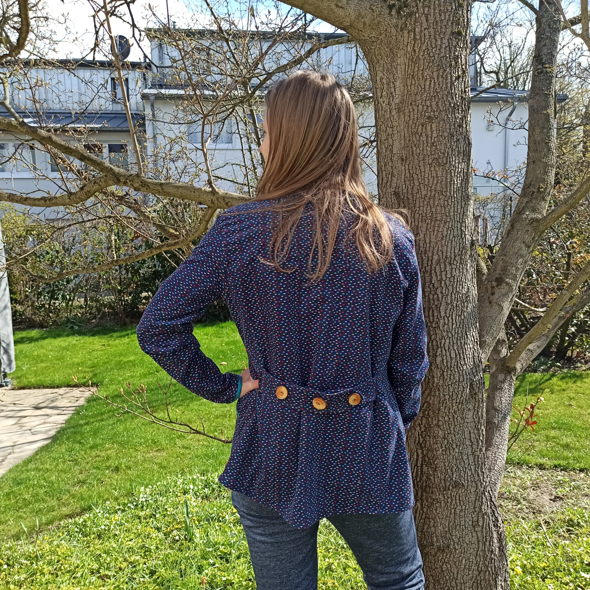 Statt eines Bindegürtels habe ich einen Rückengurt genäht, der hinten geknöpft werden kann. Die tollen Holzknöpfe fertigt Yvonnes Mann von Hand und sie passen perfekt zu meiner Käthe. Auf den Bildern trage ich Käthe übrigens zu Raja und Silja, alle Schnitte passen hervorragend zusammen.