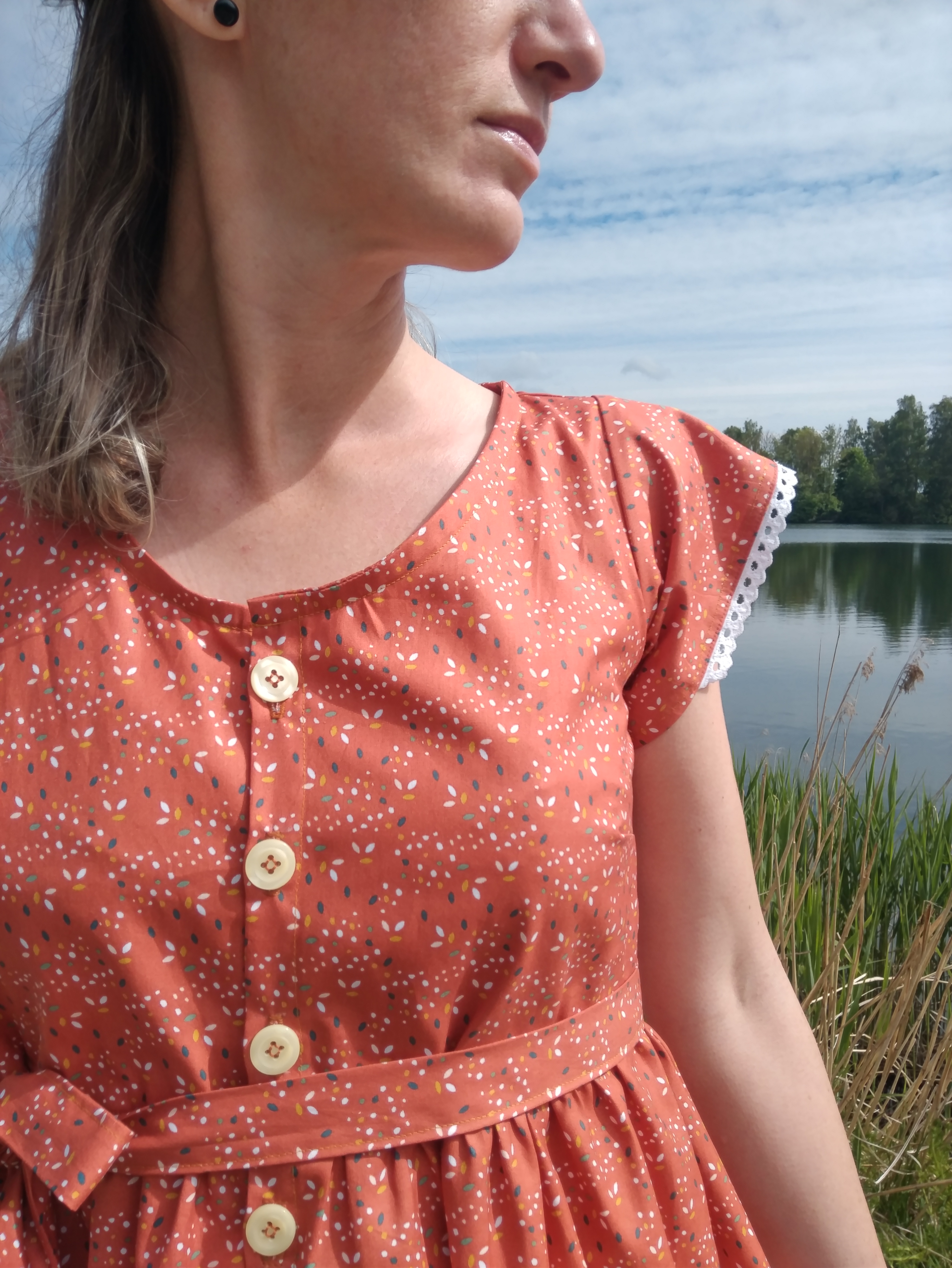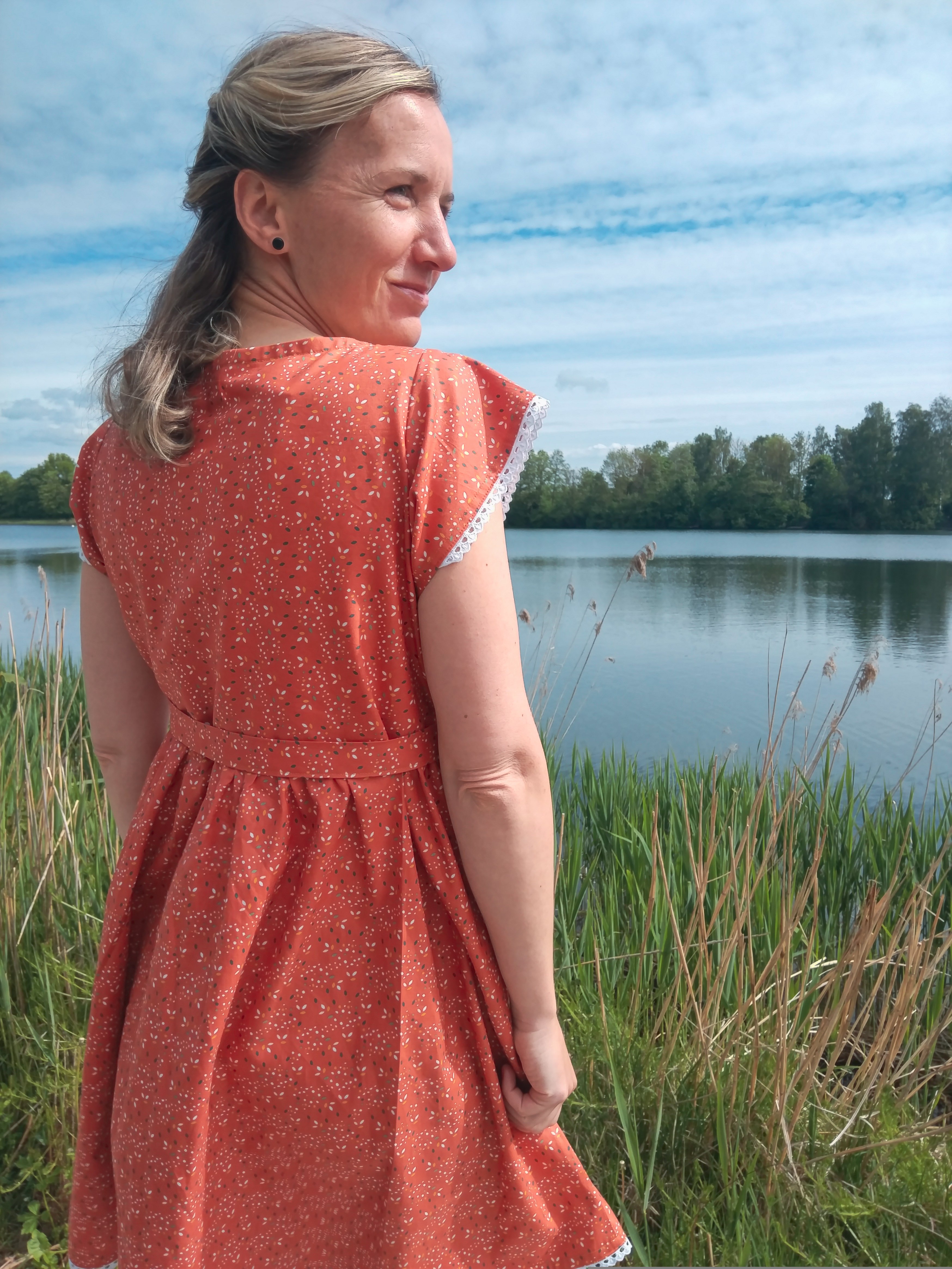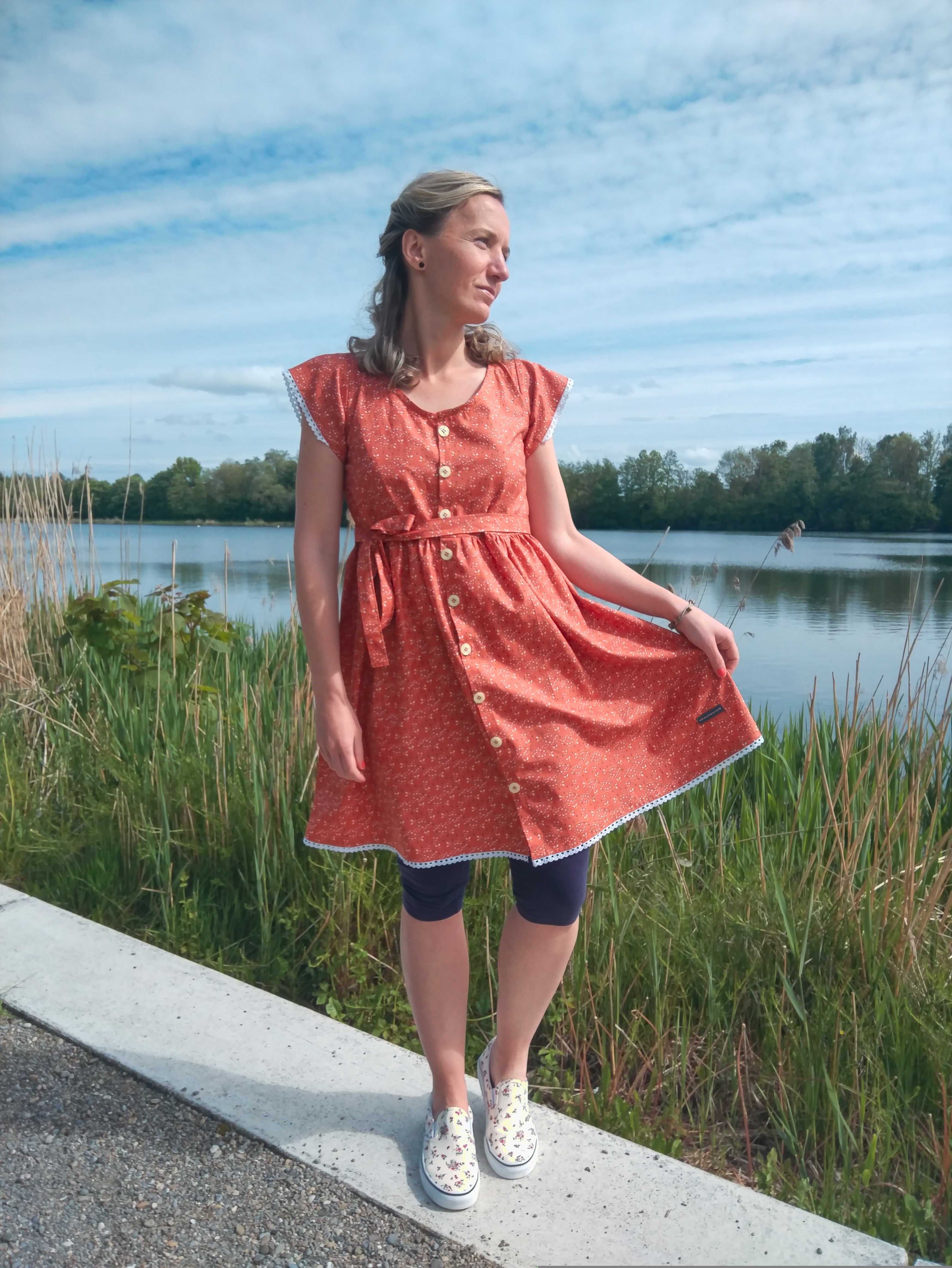 Das Damenkleid hat eine gekräuselte Taille, die Länge vom Oberteil kann perfekt jeder Körpergröße angepasst werden. Somit kann das Kleid auch hervorragend in der Schwangerschaft als Umstandskleid genäht werden. Später ist die Knopfleiste zum öffnen ideal zum stillen geeignet.