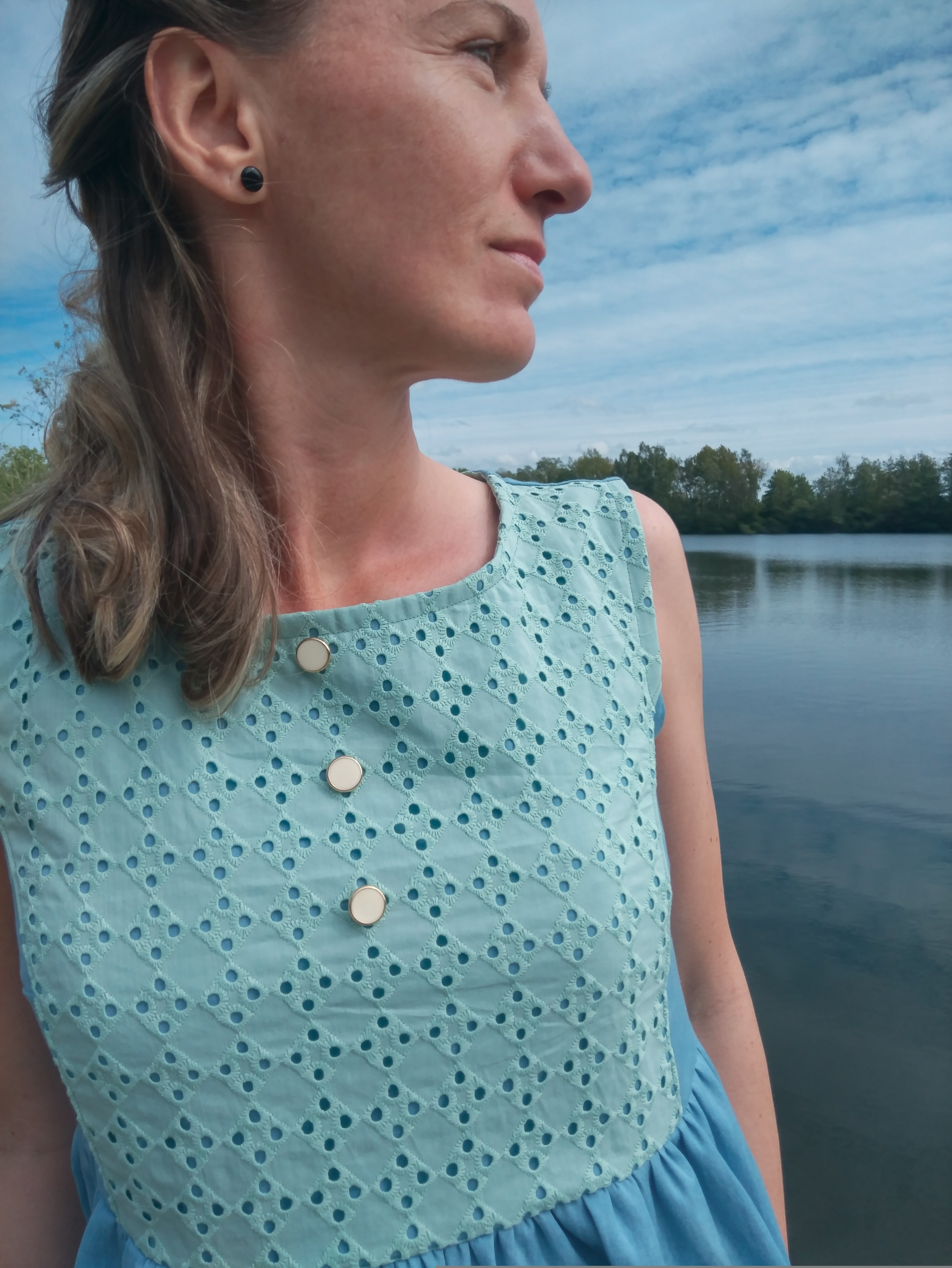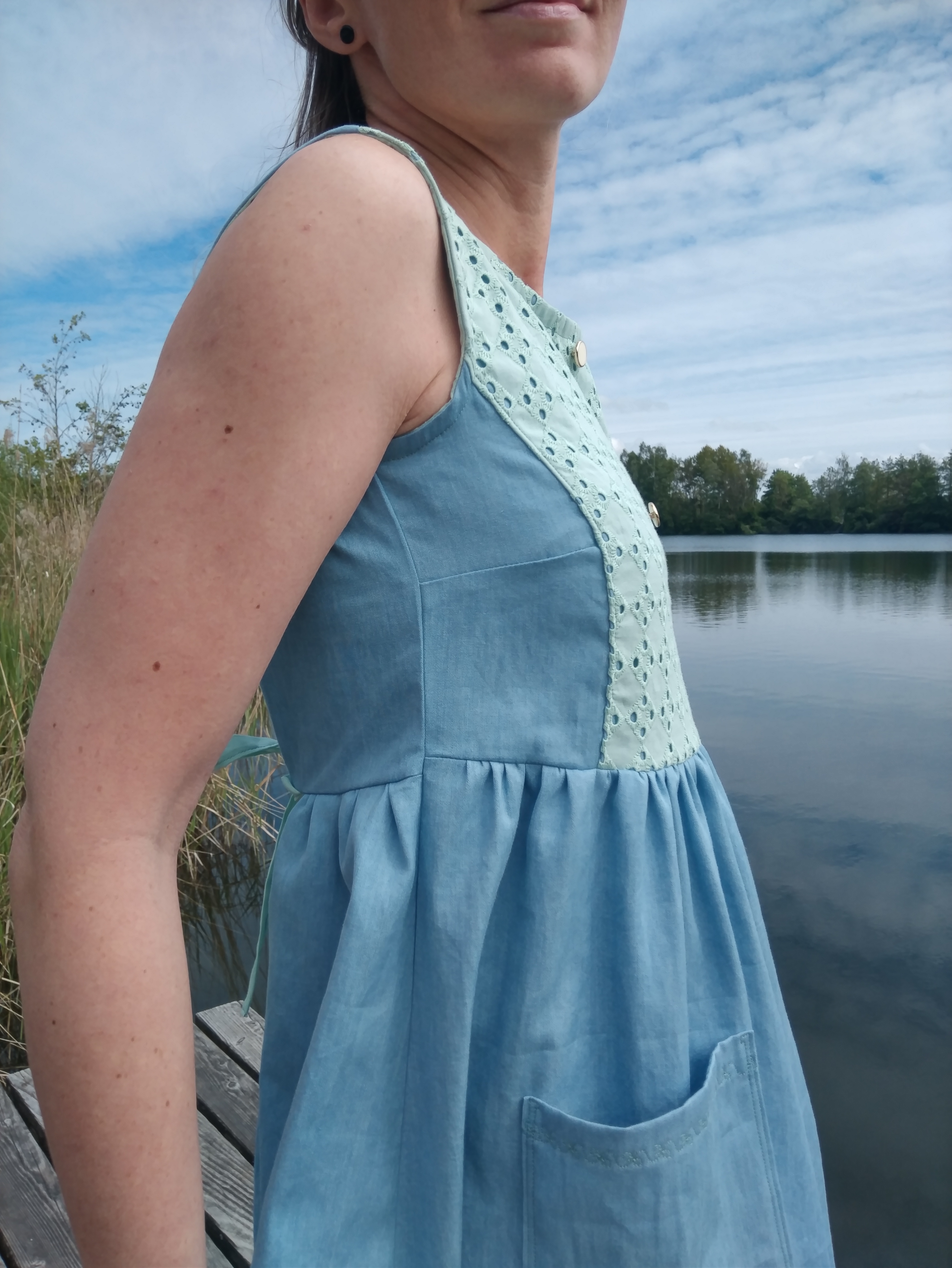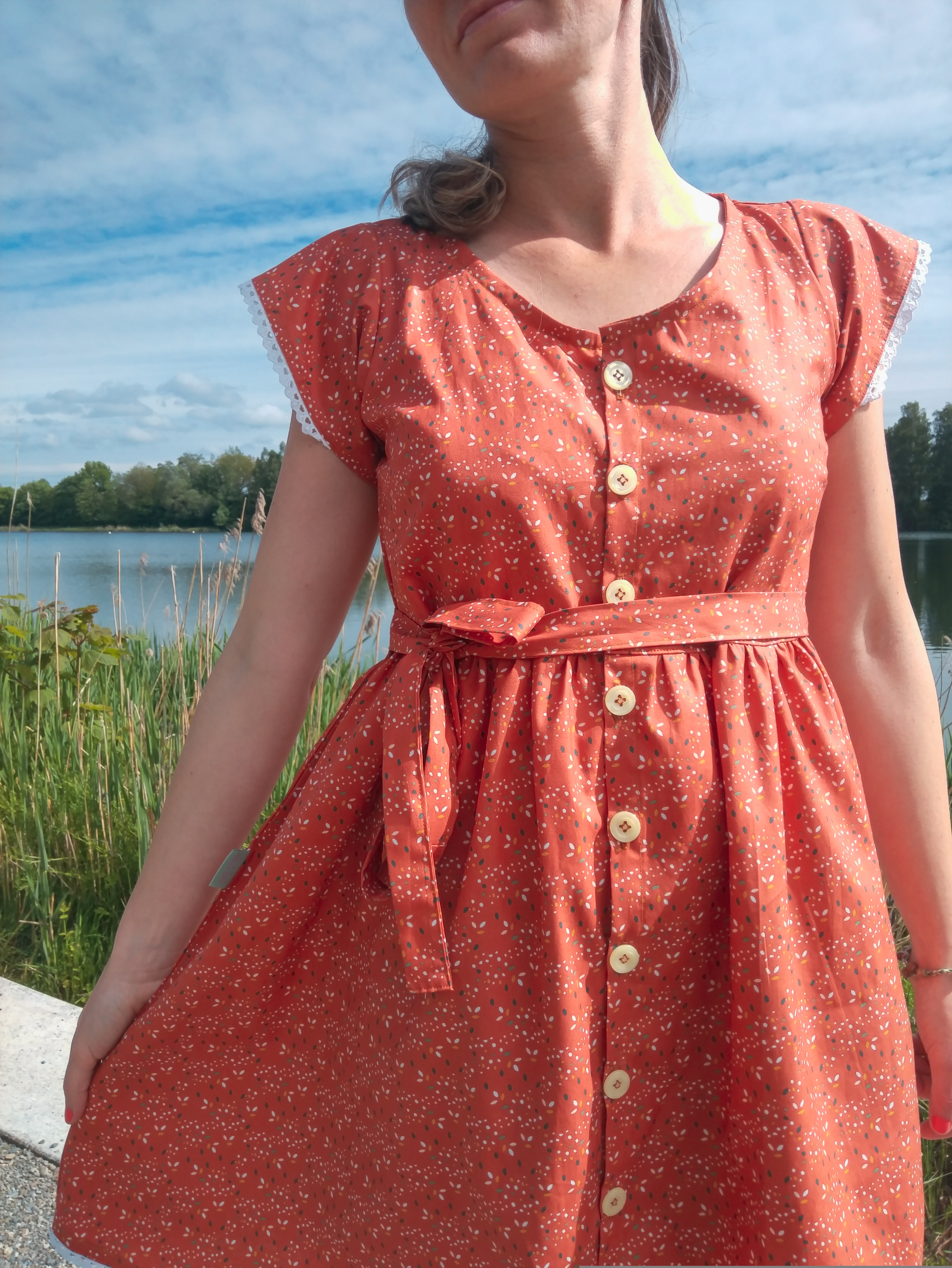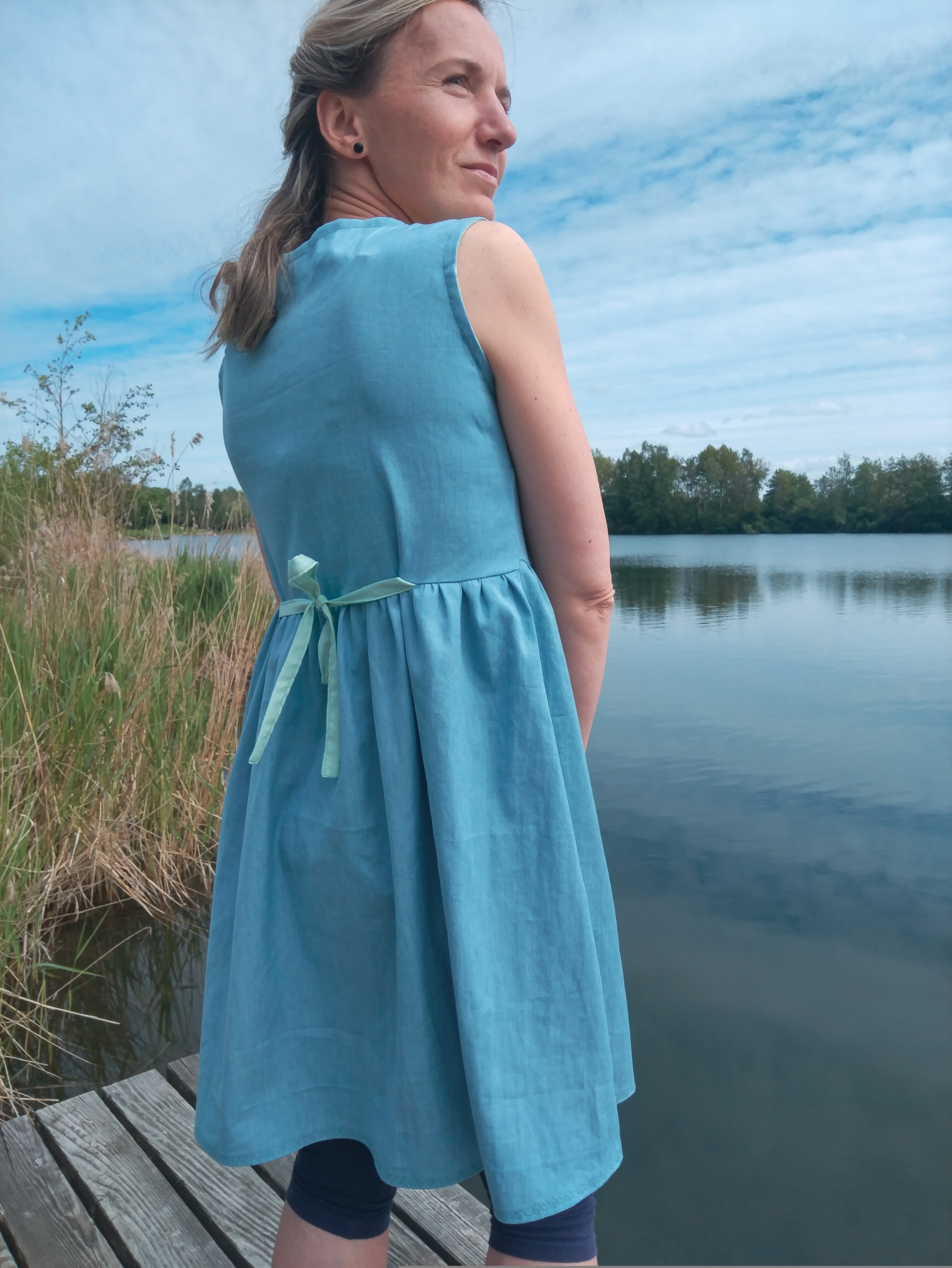 Das Damenkleid hat eine gekräuselte Taille, die Länge vom Oberteil kann perfekt jeder Körpergröße angepasst werden. Somit kann das Kleid auch hervorragend in der Schwangerschaft als Umstandskleid genäht werden. Später ist die Knopfleiste zum öffnen ideal zum stillen geeignet.
