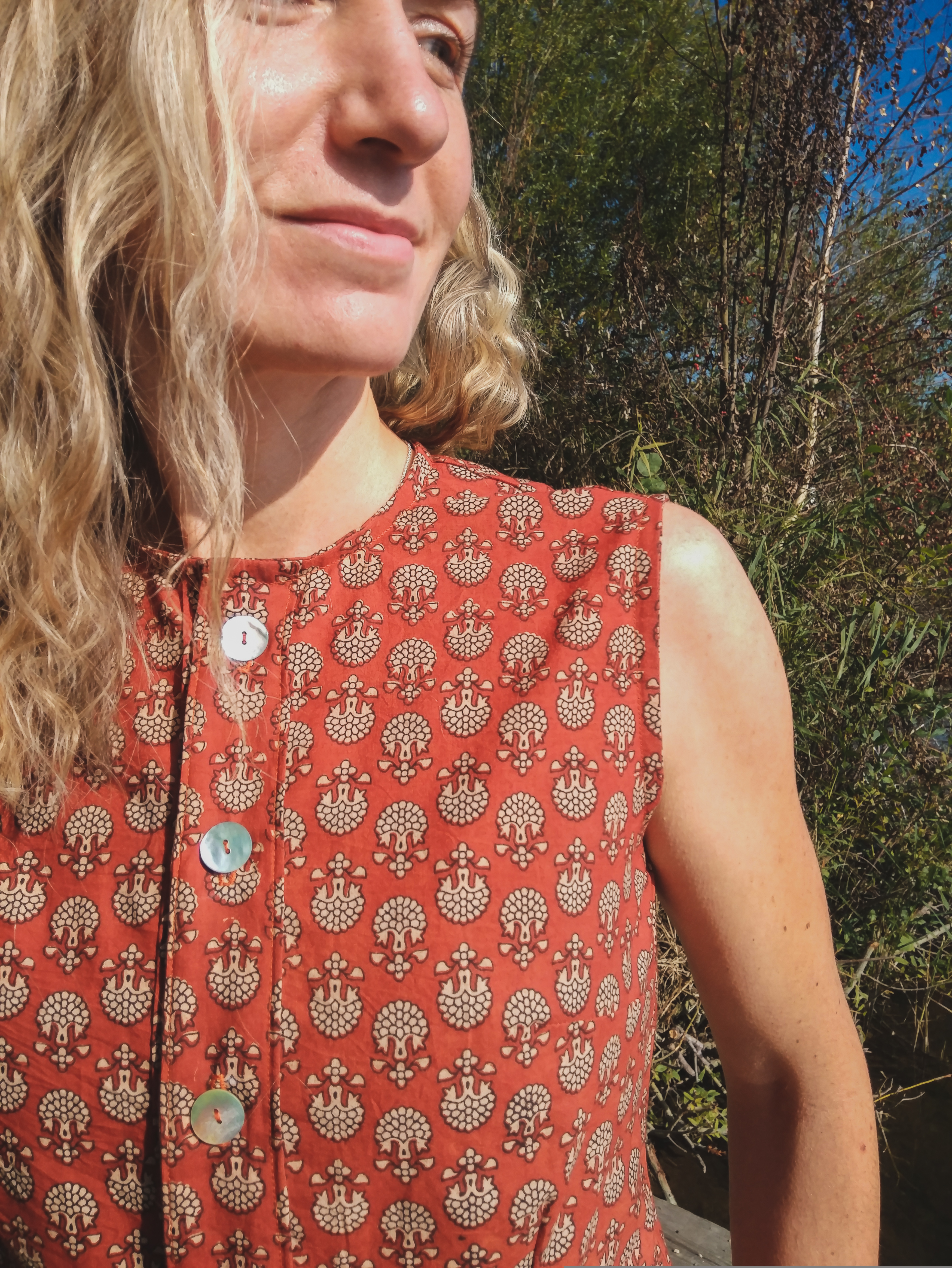 Die Bluse hat einen taillierten Schnitt, insgesamt sind 8 Abnäher zum Nähen. Zwei Brustabnäher, zwei Schulterabnäher und vier Taillenabnäher. Die Knopfleiste ist eine „angenähte Verschlussleiste“ was bedeutet, dass die Knopfleiste ein separates Schnittteil ist und an die vordere Mitte der Bluse genäht wird. Der kurze Arm kann mit oder ohne Aufschlag genäht werden. Du kannst auch gerne auf den Ärmel verzichten, dann wird das Armloch mit einem Schrägband versäubert. Diese Variante ist ideal für die warme Jahreszeit. Wenn du dich gegen den Bubikragen entscheidest wir der Halsausschnitt ebenfalls mit einem Schrägband versäubert. Beim langen Arm gibt es mehrere Varianten für die Umsetzung. Der süße Ballonärmel hat eine mäßige Weite an der Schulter, es kann aber noch „Mehrweite“ hinzugefügt werden, dazu findest du ein separates Kapitel in der Nähanleitung. Der Ärmelsaum wird mit einer Manschette und einem eingefassten Schlitz geschlossen. Gerne kannst du auf die Ärmelmanschette verzichten und den Saum auch mit einem Gummiband einfassen. Eine kleine Brusttasche kann an alle Varianten genäht werden. Du siehst, es gibt so viele verschiedenen Möglichkeiten sich seine MAGRET zu nähen. 🤎