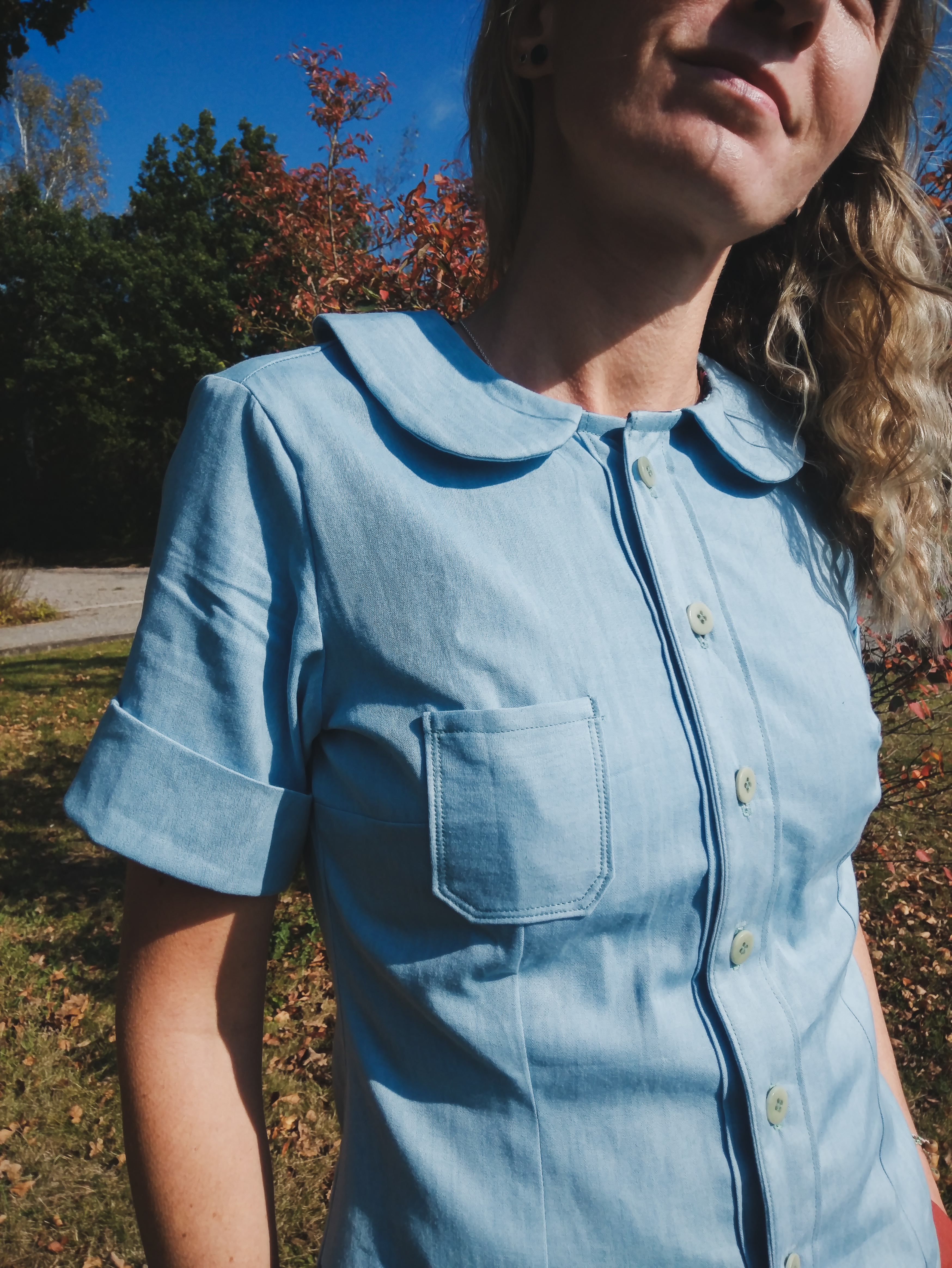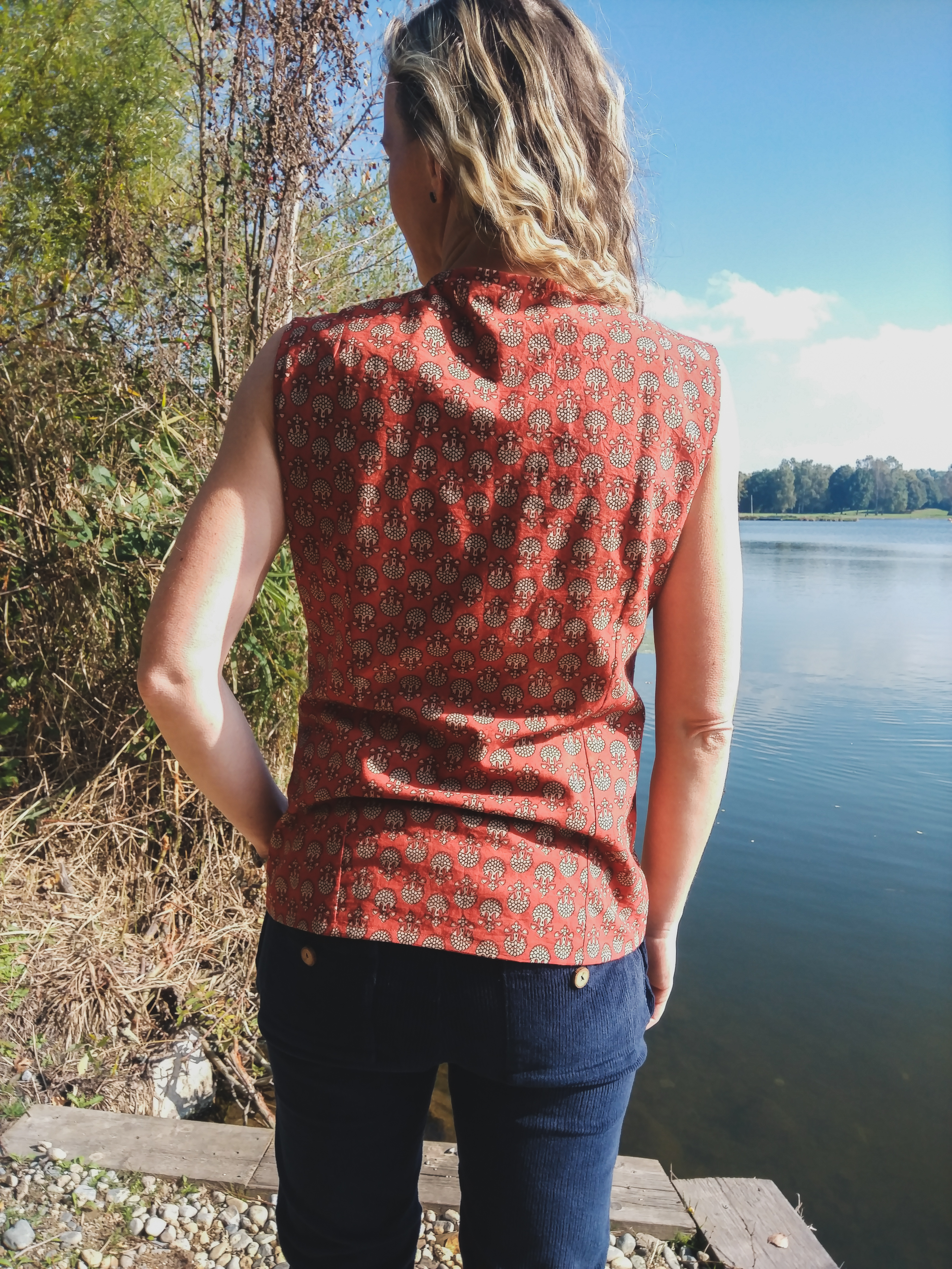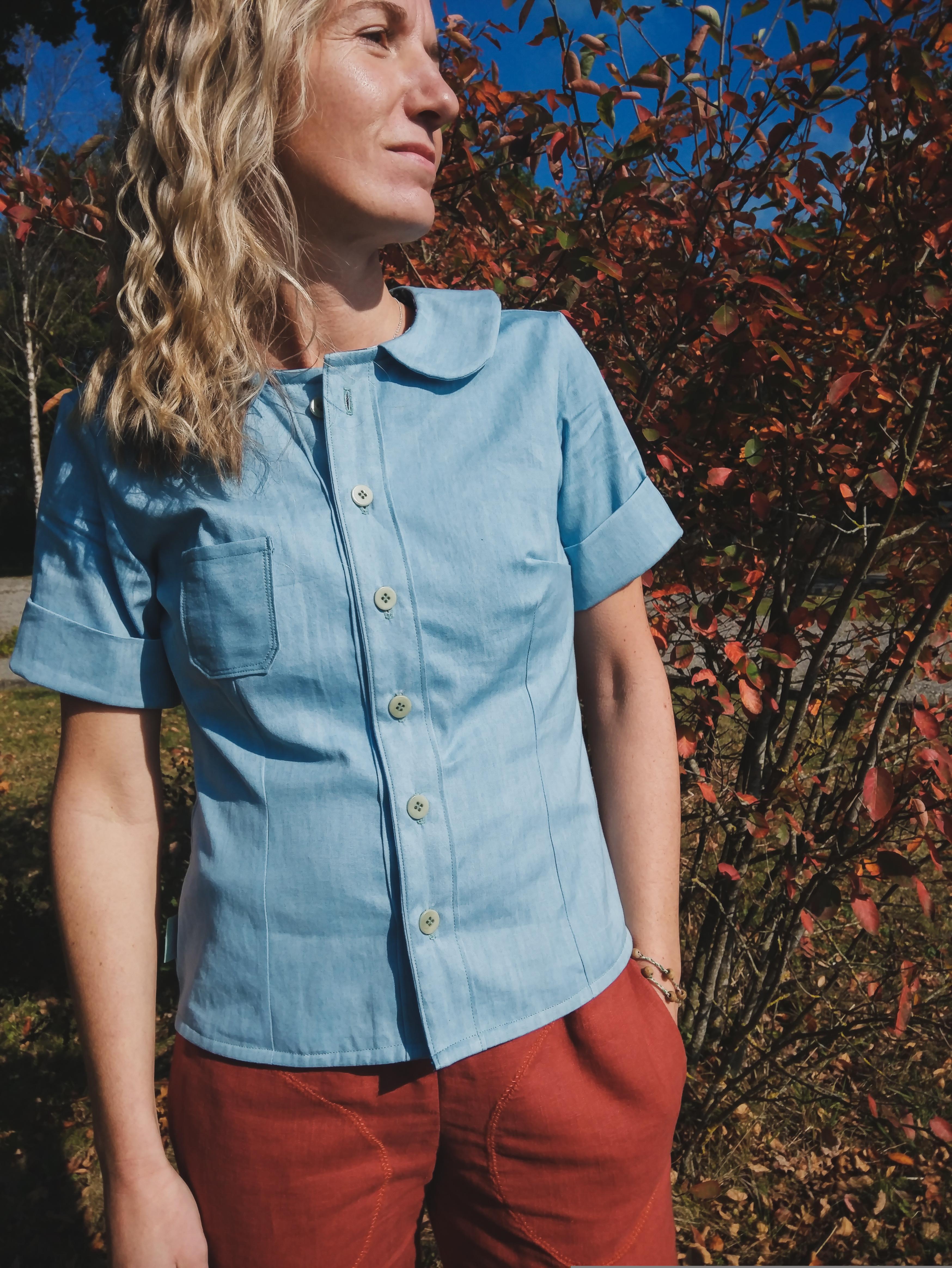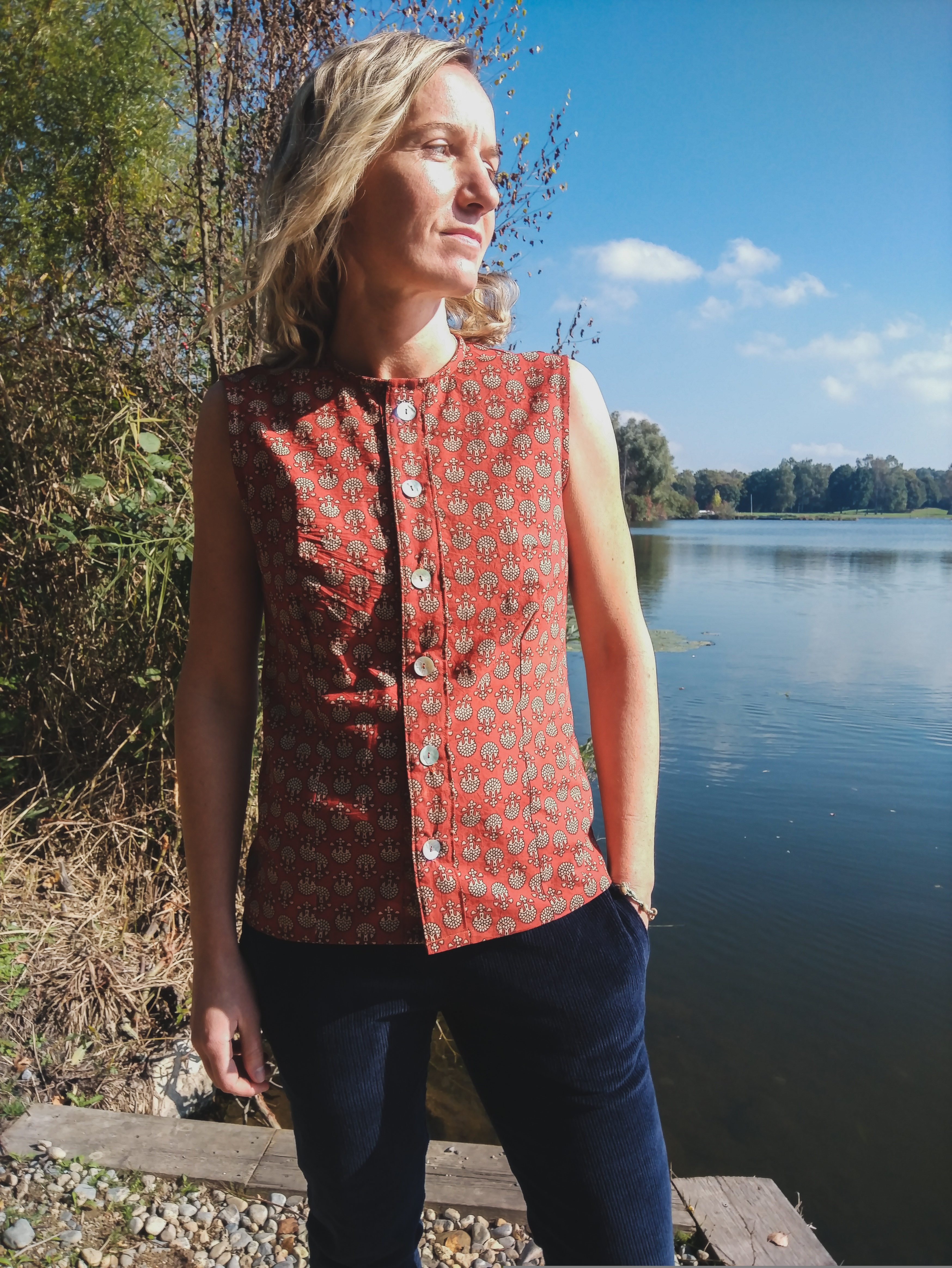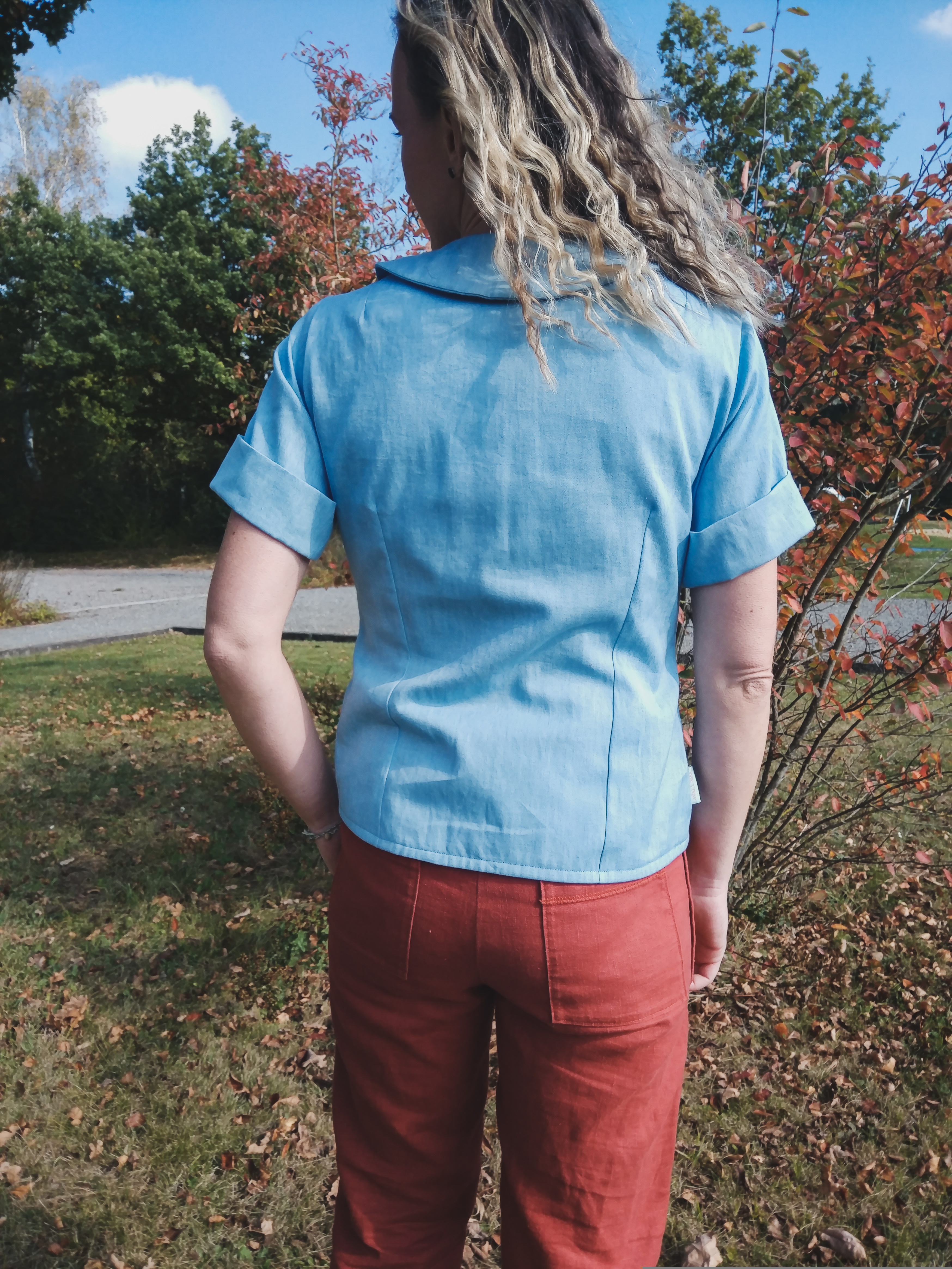 Natürlich möchte ich euch Bilder meiner MAGRET nicht vorenthalten. Ich habe alle drei Blusen in der Größe 34 genäht, ohne Anpassungen und genau nach Schnittmuster. Die kurz Arm Bluse ist aus einem leichten Chambray Stoff genäht der ein Gewicht von 150 gr. hat. Die Bluse ohne Arm ist aus einem Baumwollstoff und die lang Arm Bluse ist aus Musselin mit Druckknöpfen.
